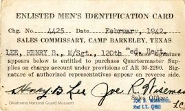 Enlisted Men's Identification Card issued to henry B Lee, Headquarters and Service Company 120th Medical Regiment, used to purchase supplies for the unit. His wife is an approved user on the reverse