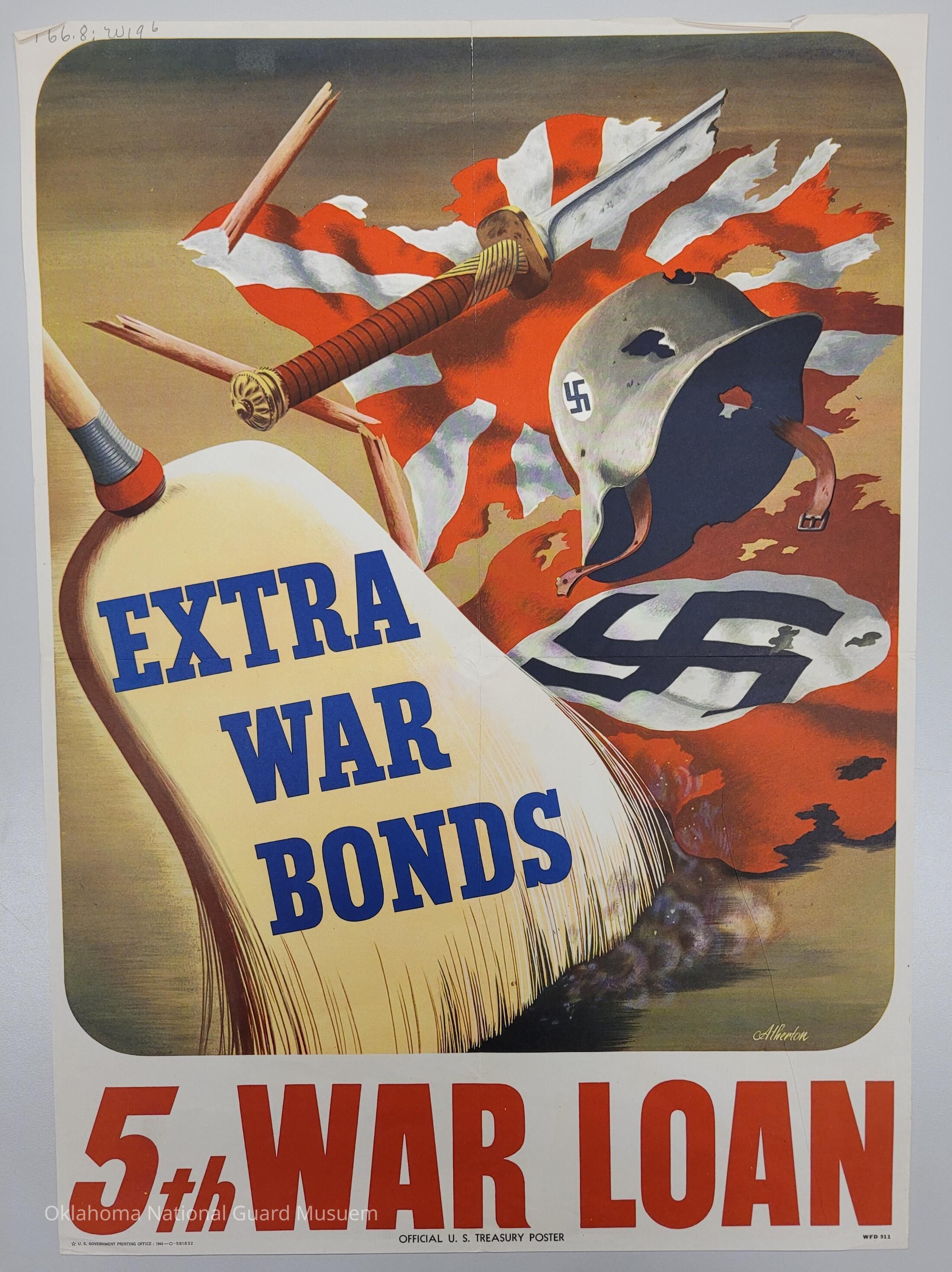 Image created by the artist John Atherton for the United States Treasury to support the 5th War Loan Drive which ran in June and July 1944. Atherton’s image features large “Extra War Bonds” broom sweeping away tattered German and Japanese flags, a German helmet with bullet holes and a broken Japanese swordCollection