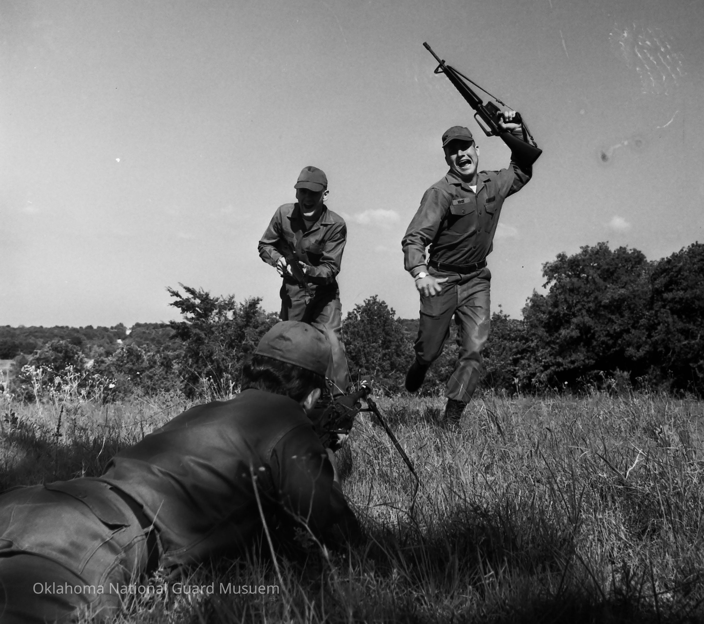 Negative of soldiers enacting an infantry attack