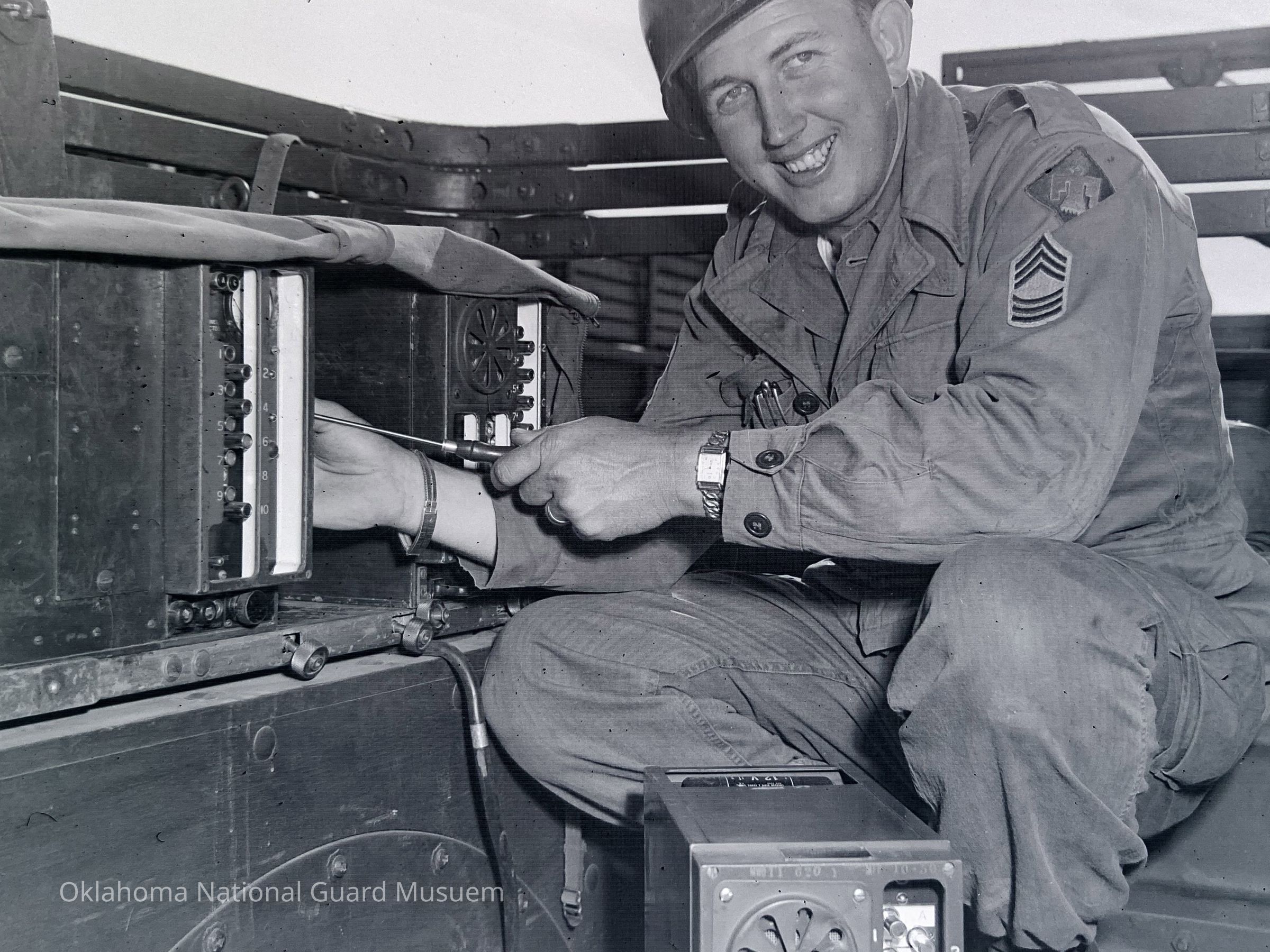 Soldier repairing communication gear