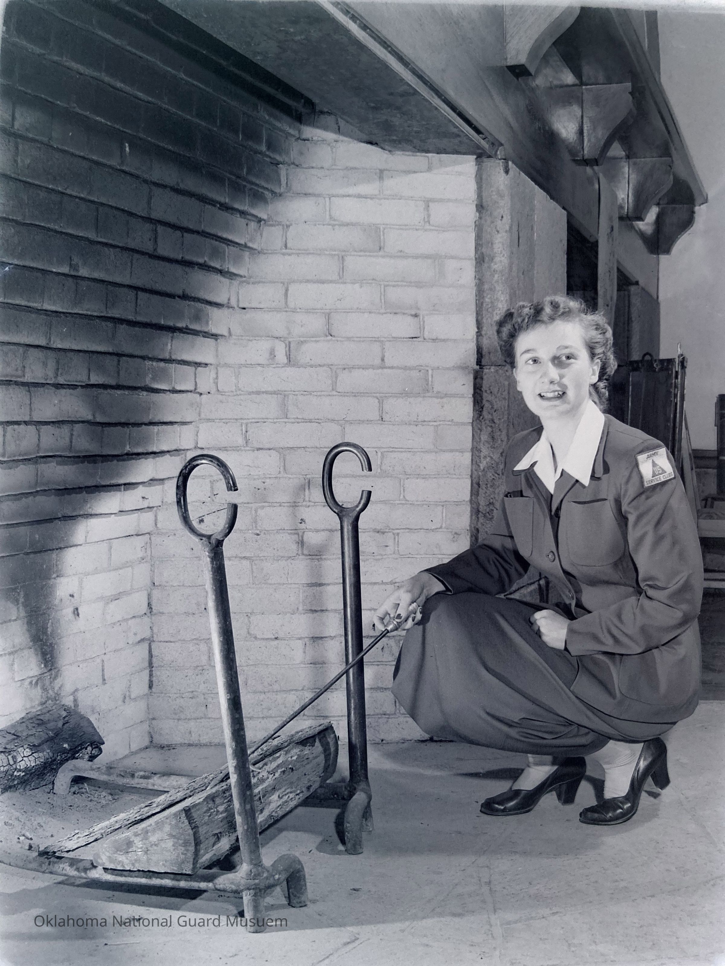 Female Army Service Club member in front of a large fireplace