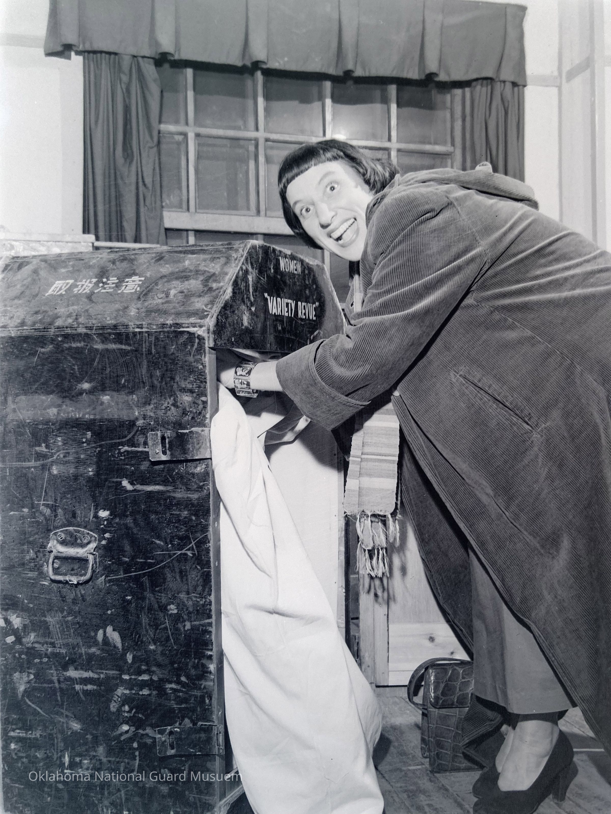 Negative of a female entertainer unpacking her trunk on Hokkaido, Japan
