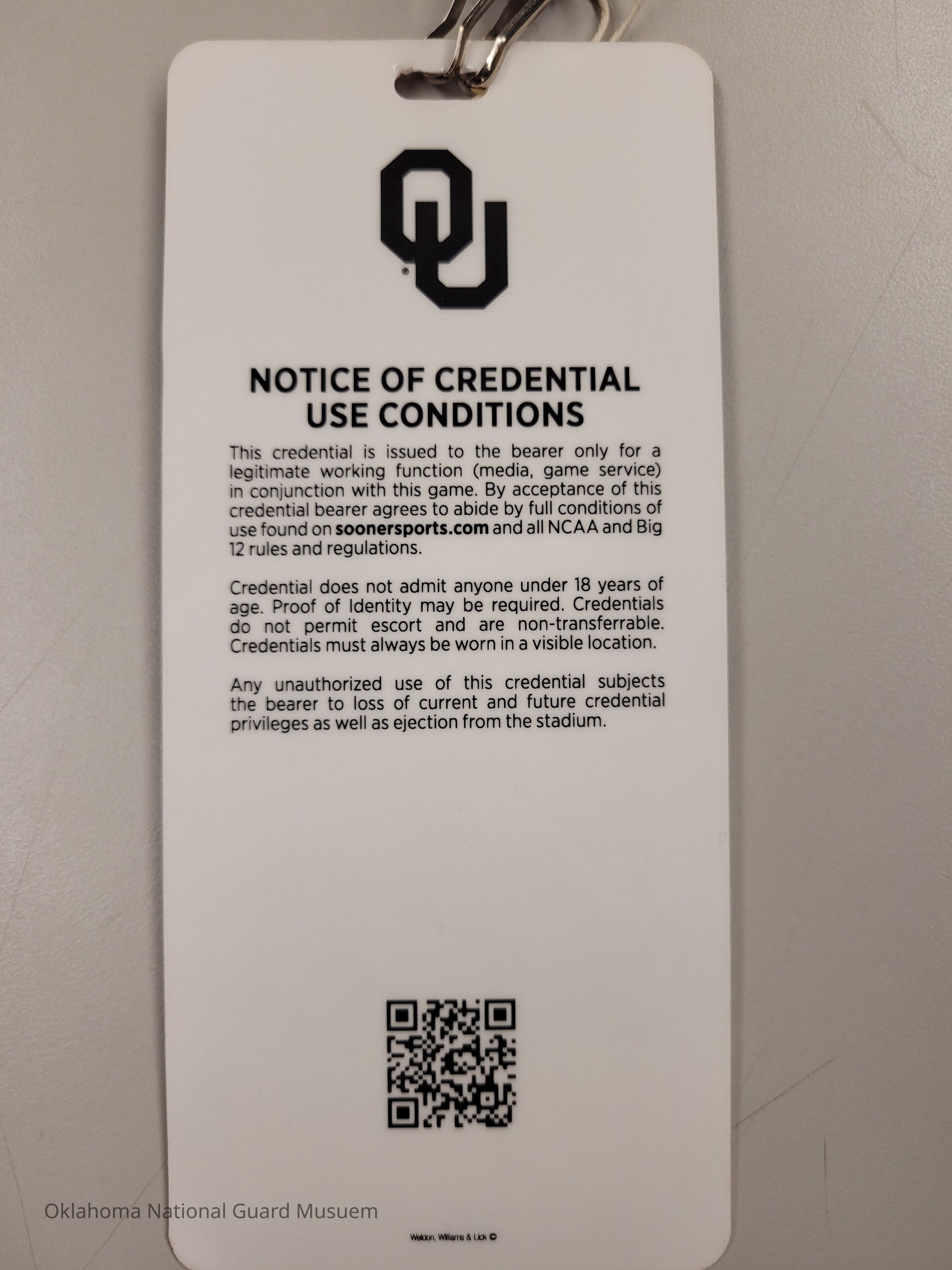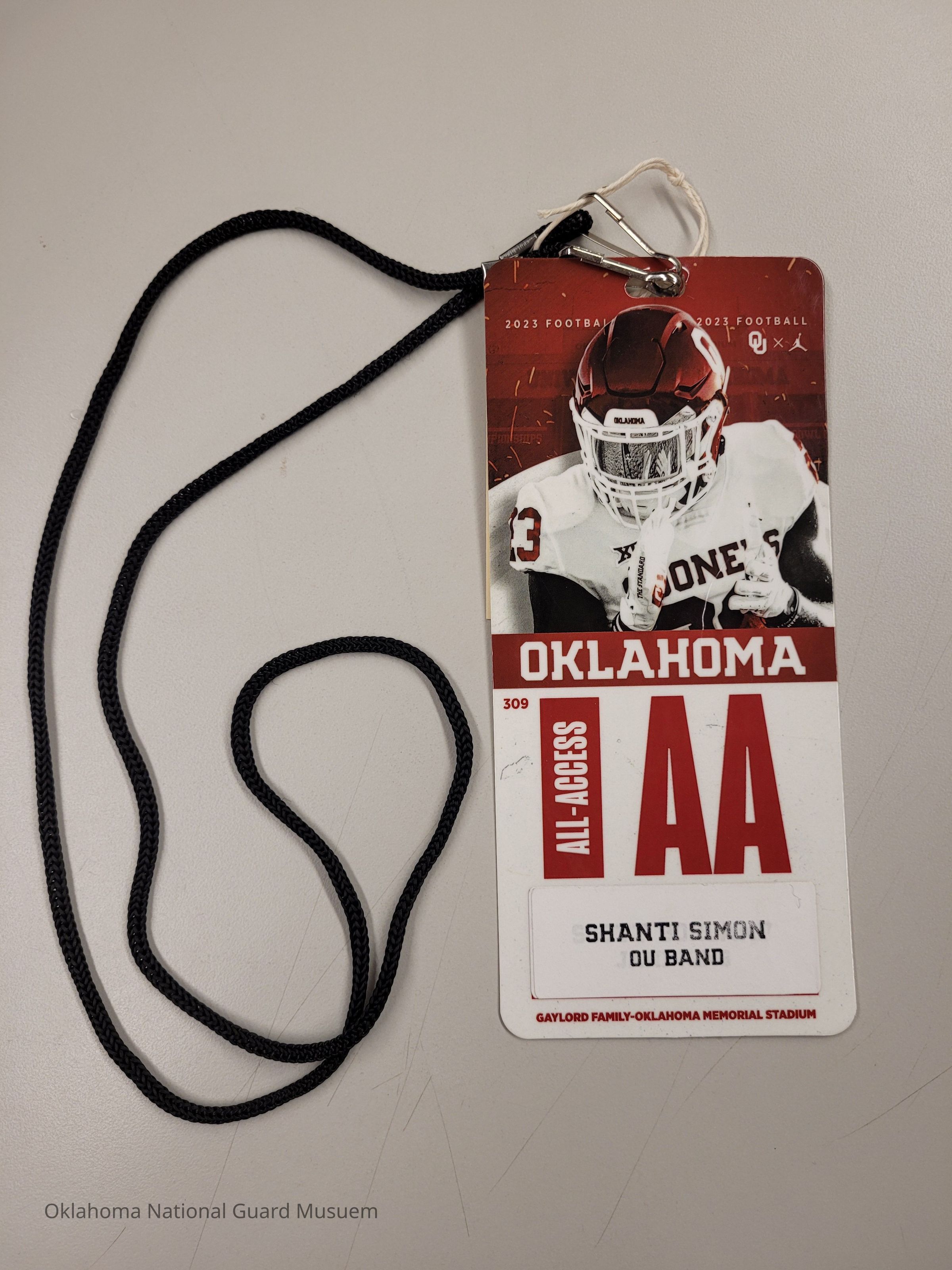 Field Pass belonging to Shanti Simon, Director of Bands at the University of Oklahoma. She also serves as the Public Affairs Officer for the 137th Oklahoma Air National Guard Wing at Will Rodgers.