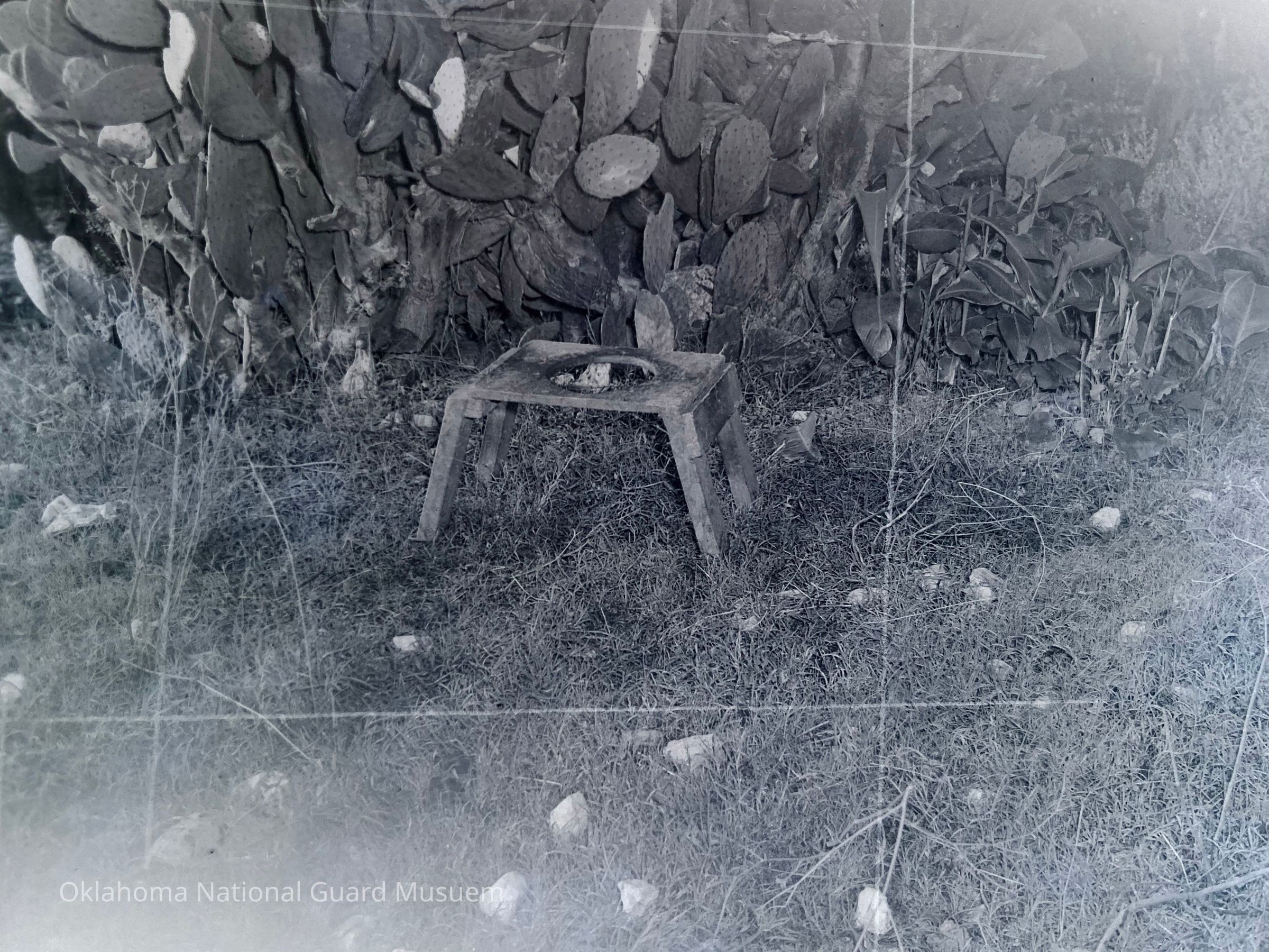 Published in the 45th Division News, 11 November 1943, Vol. IV, No 18. Caption "This piece of apparatus is the pride of the G-2, it's most cherished possession. Through maneuvers in the States it served the section well. It made the initial landing in Sicily. But today, no one in G-2 will put it to the use for which it was intended, because it has new sentimental value. When Bob Hope visited and entertained the division in Sicily he brought with him dark-haired singing Frances Langford, idol movies and radio audiences. Miss Langford visited headquarters, and while there she employed the device. Since that great occasion, no other bottom has profaned it. And swear the proud members of the G-2 Section, no other bottom ever shall."Made/Created
