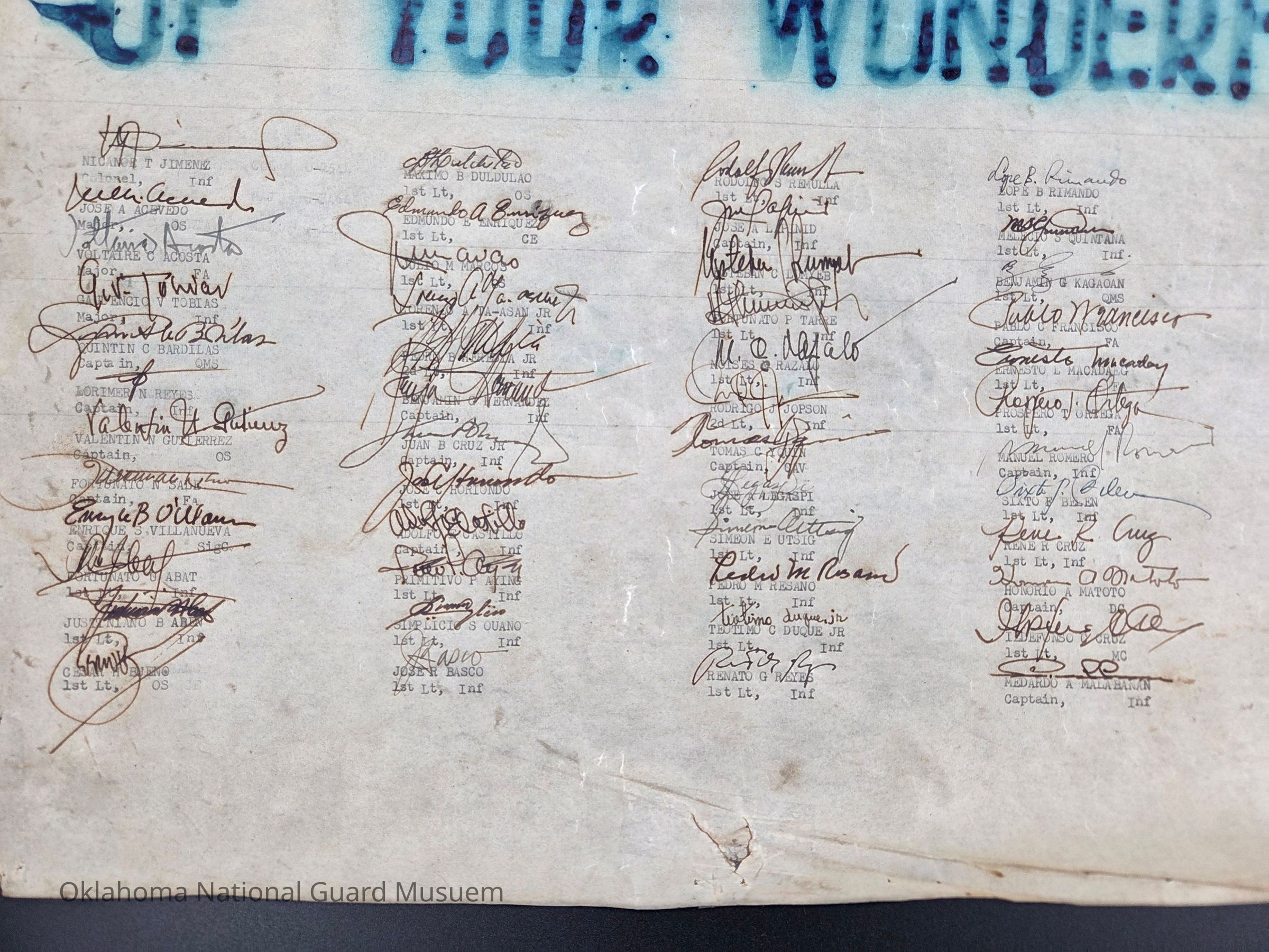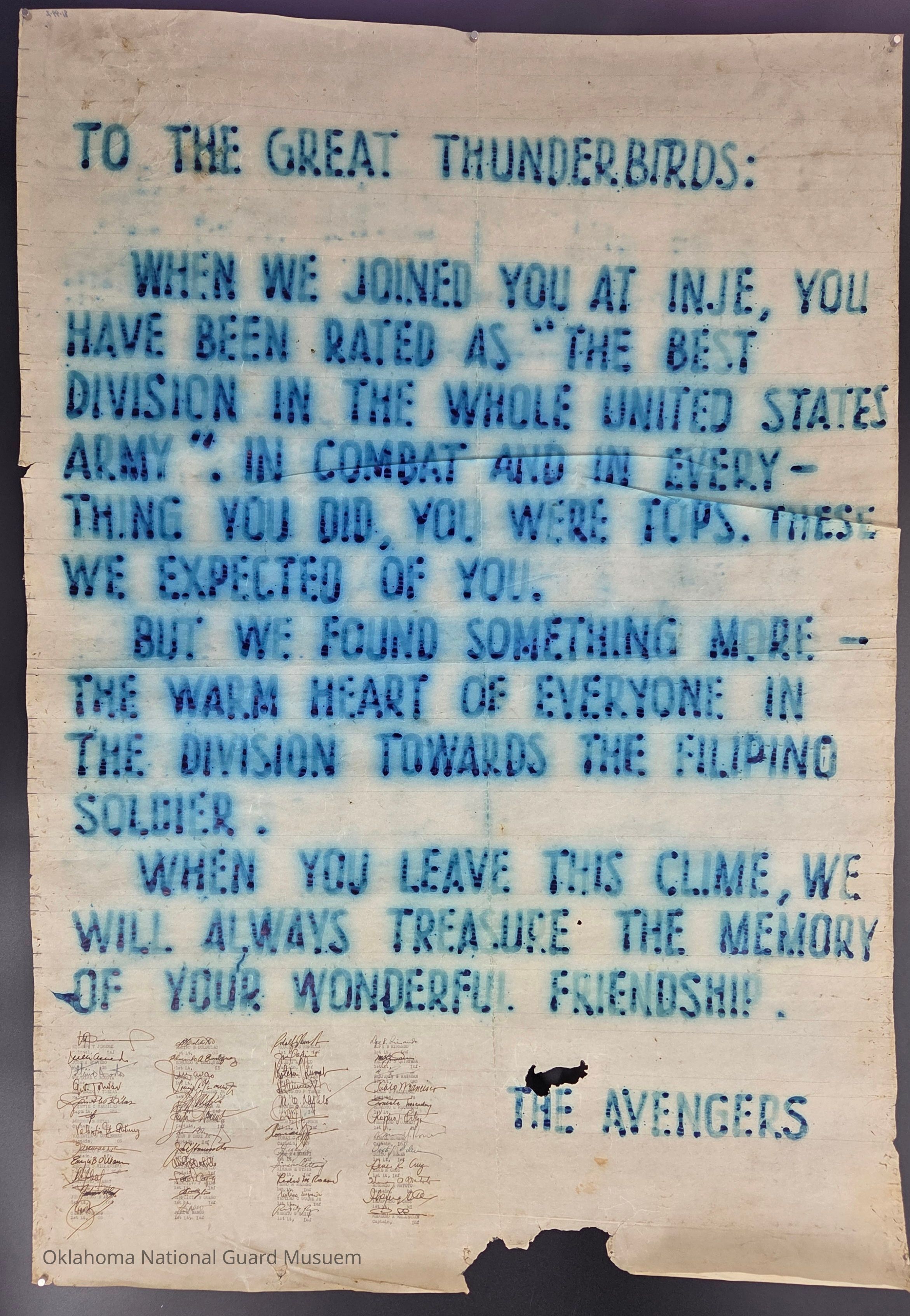 Filipino soldiers "thank you" to the 45th Division for their service, partnership, and friendship during the Korean War. Signed by Filipino officers from "The Avengers" at the bottomContext