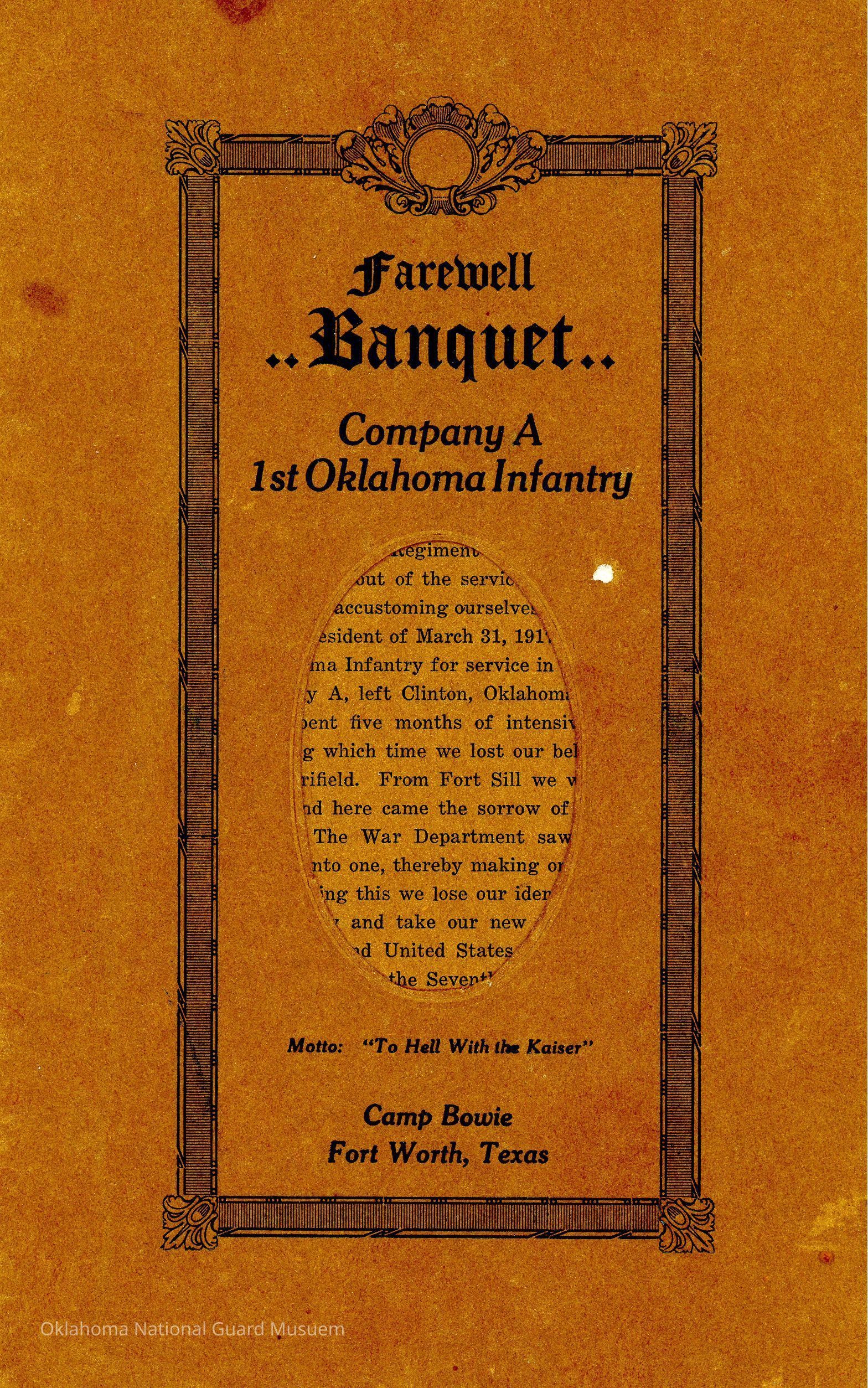 This farewell banquet was had before the First Oklahoma Infantry merged with elements of the Texas National Guard and became the 142nd Infantry during World War One.