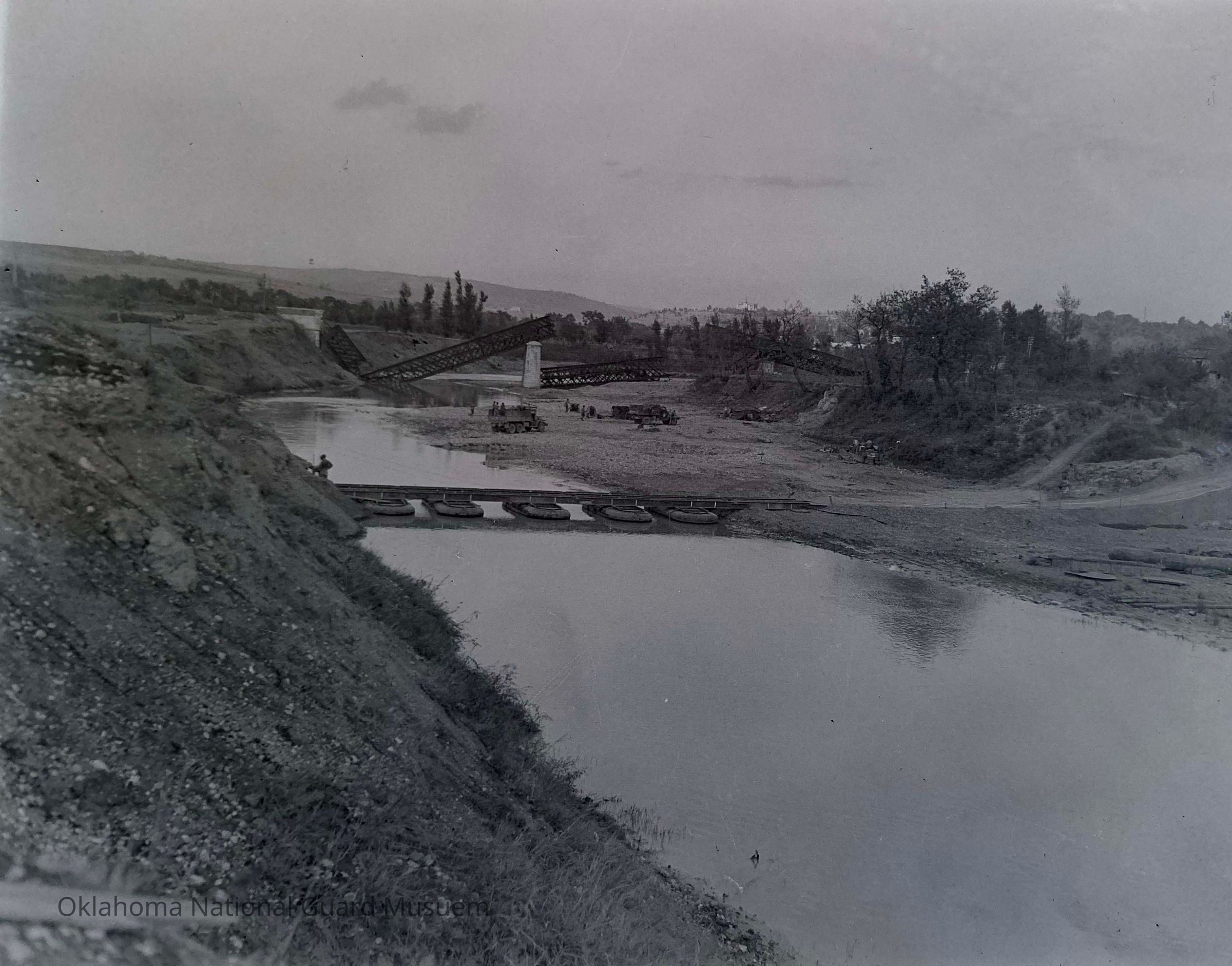 Negative of a floating bridge over Calore River. 120th Engineers