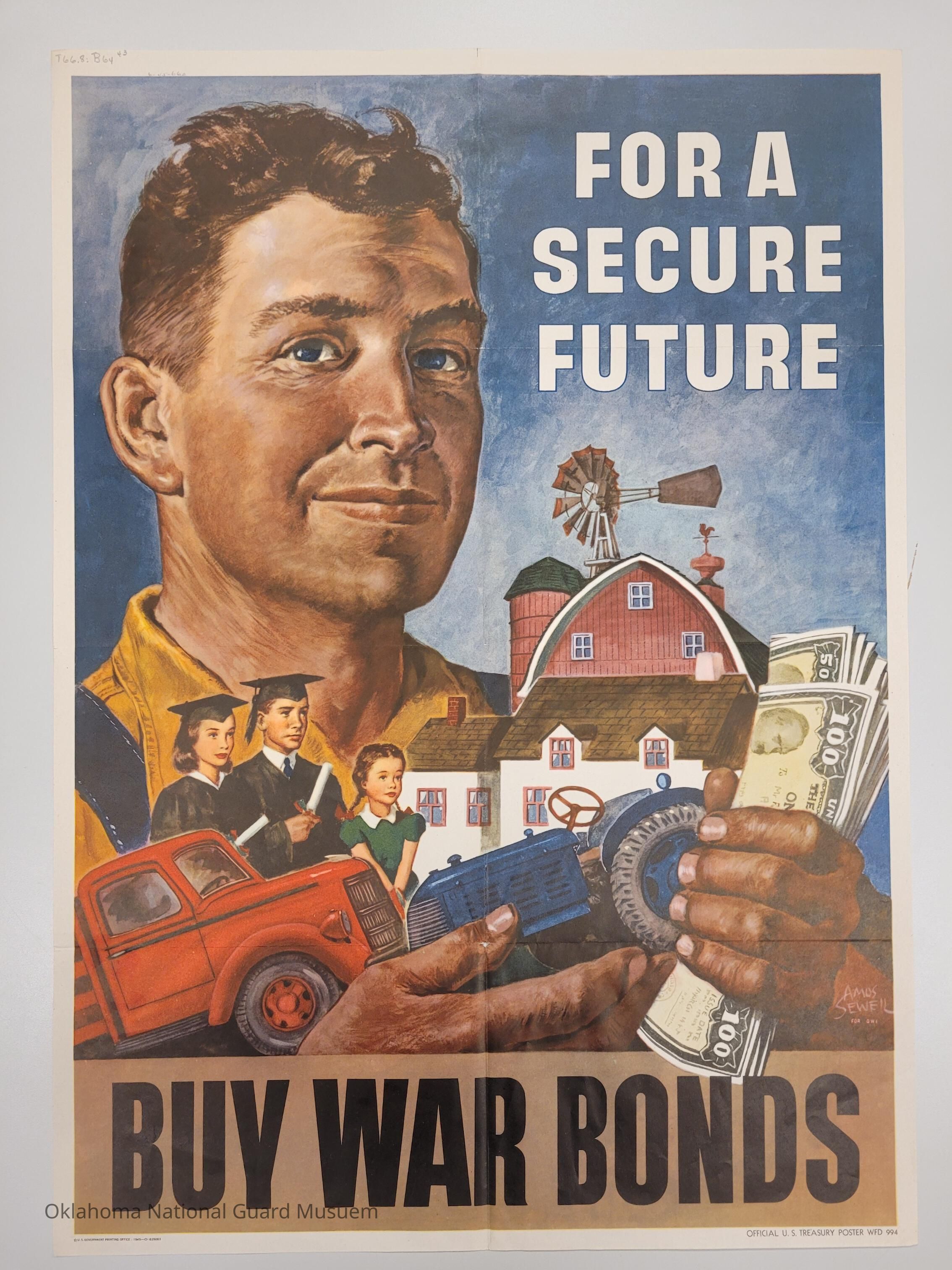 The young farmer depicted in this poster is shown clutching numerous war bonds in one hand as he cradles what can be interpreted as his future in the other. A house, a barn, a truck, a tractor – as well as his graduation – all depict an ideal future. All of this will happen if the war is won – and that might happen if he purchases war bonds to help the war effortCollection