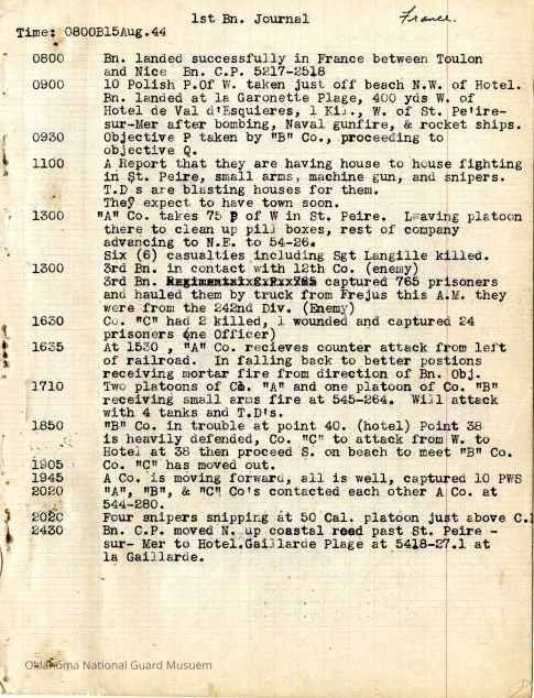 Daily journal of First Battalion 180th Infantry in the French Campaign. Compiled by Clyde Hoestetler- Battalion Sergeant Major