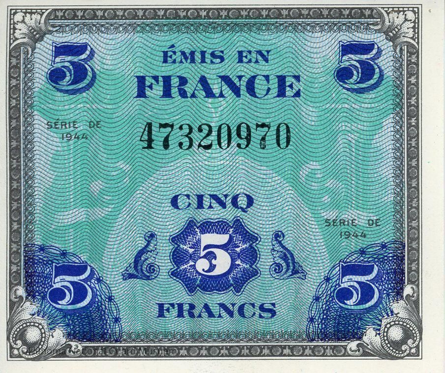 French Five Franc Type 1944. Supplemental French currency after liberation. Series 1944.