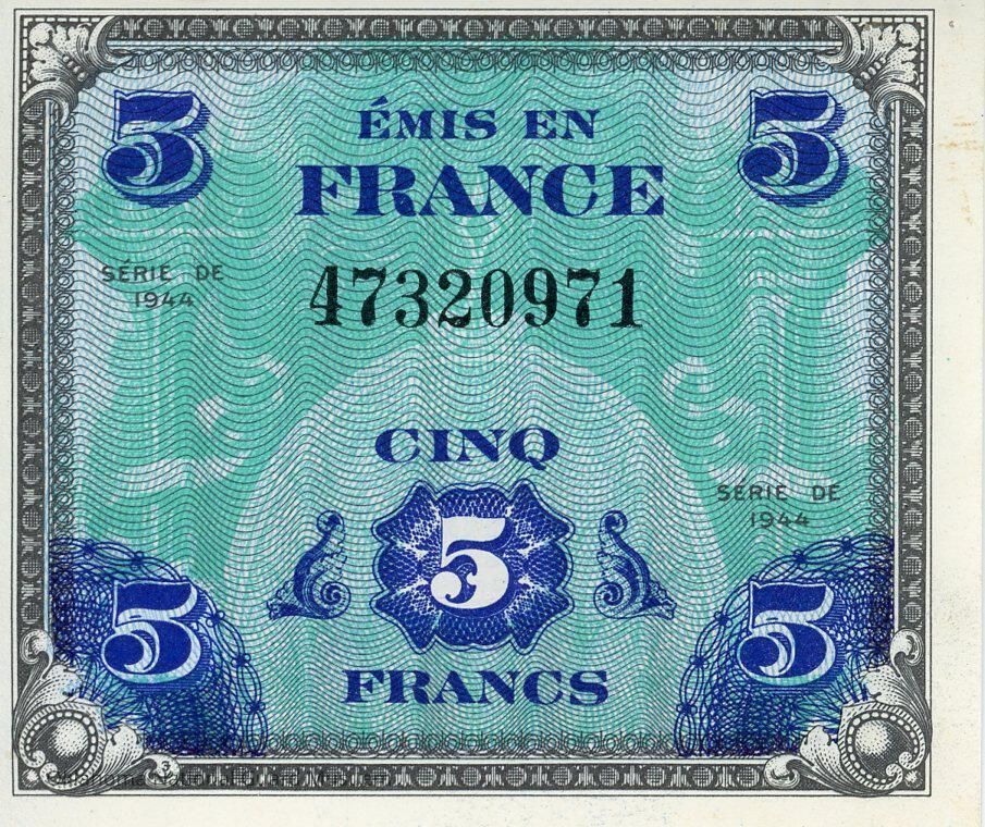 French Five Franc Type 1944. Supplemental French currency after liberation. Series 1944.