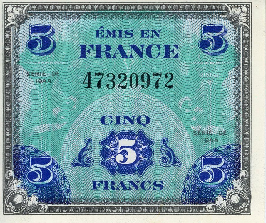 French Five Franc Type 1944. Supplemental French currency after liberation. Series 1944.