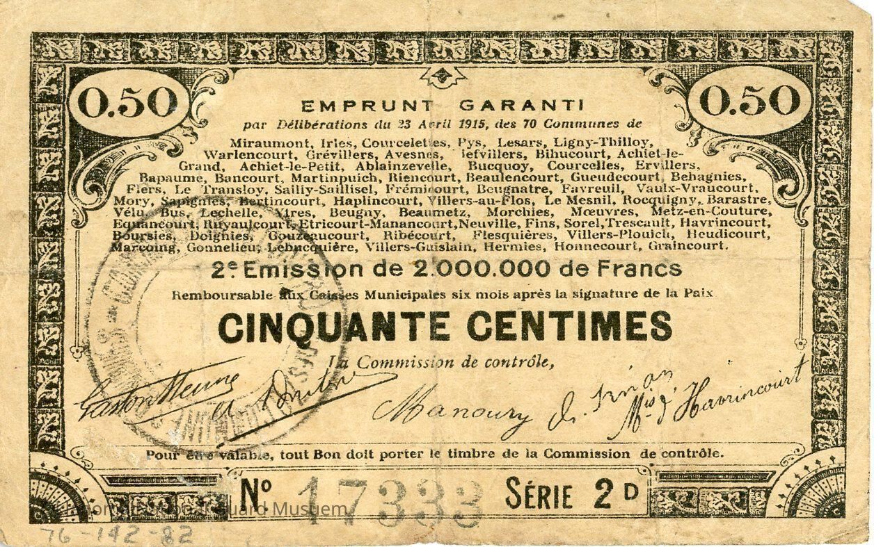 French Local Currency Fifty Centimes. Dated April 23, 1915.