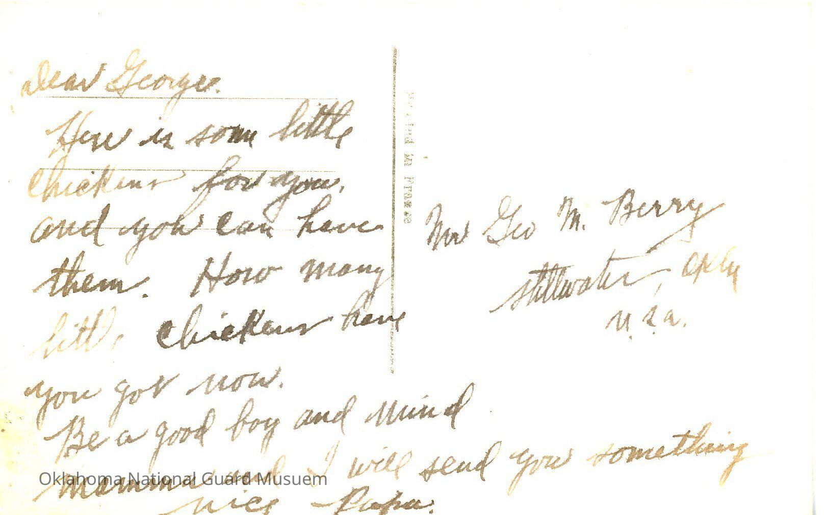 Dear George, Here is some little chickens for you, and you can have them. How many little chickens have you got now? Be a good boy and mind mamma and I will send you something nice. Papa