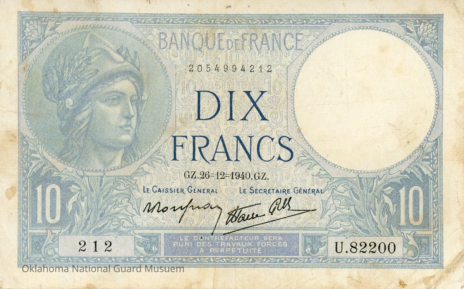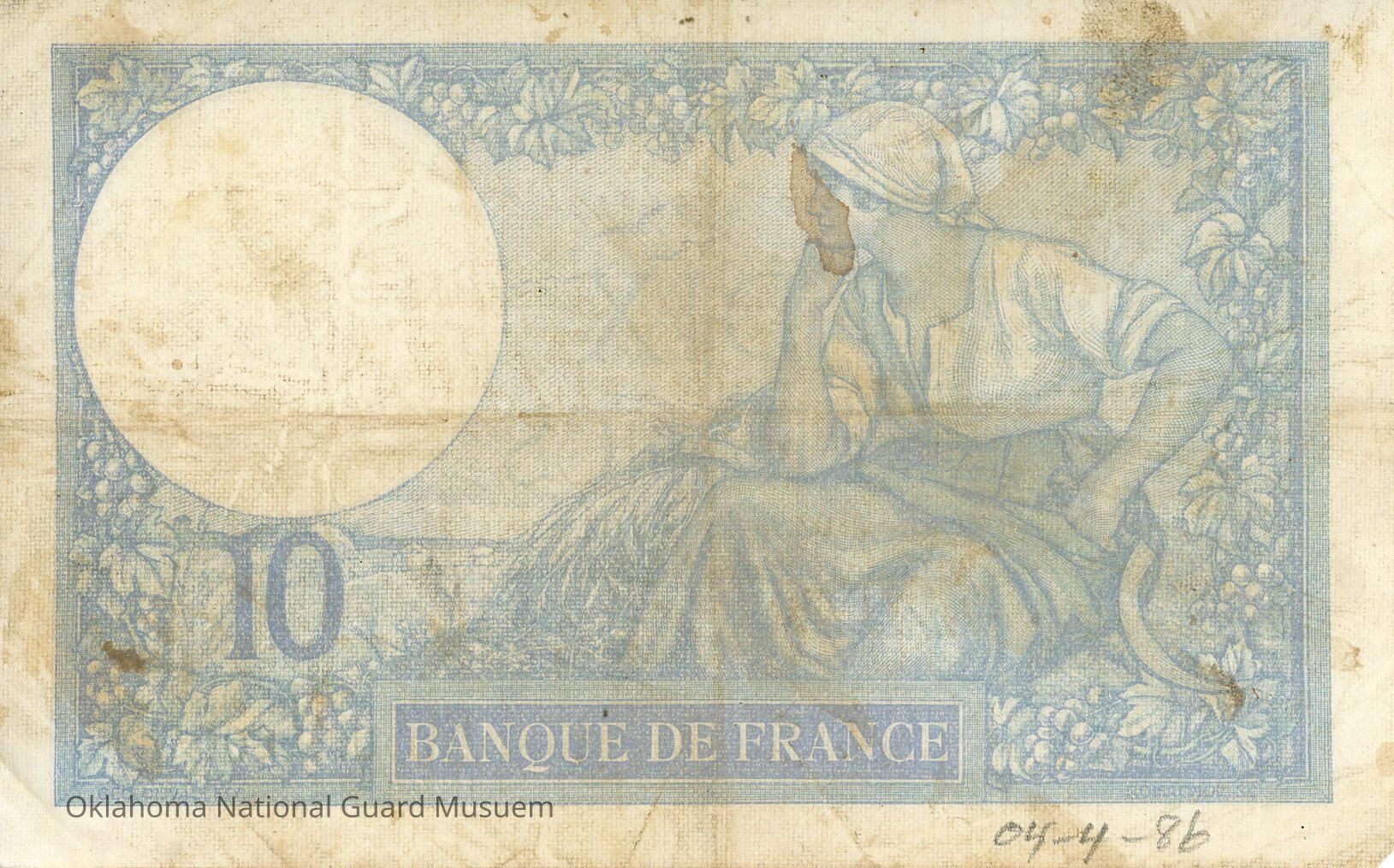 French Ten Francs Minerve Type 1915 Modified. Accession number written on reverse at bottom. Staining on both sides. Dated December 26, 1940.