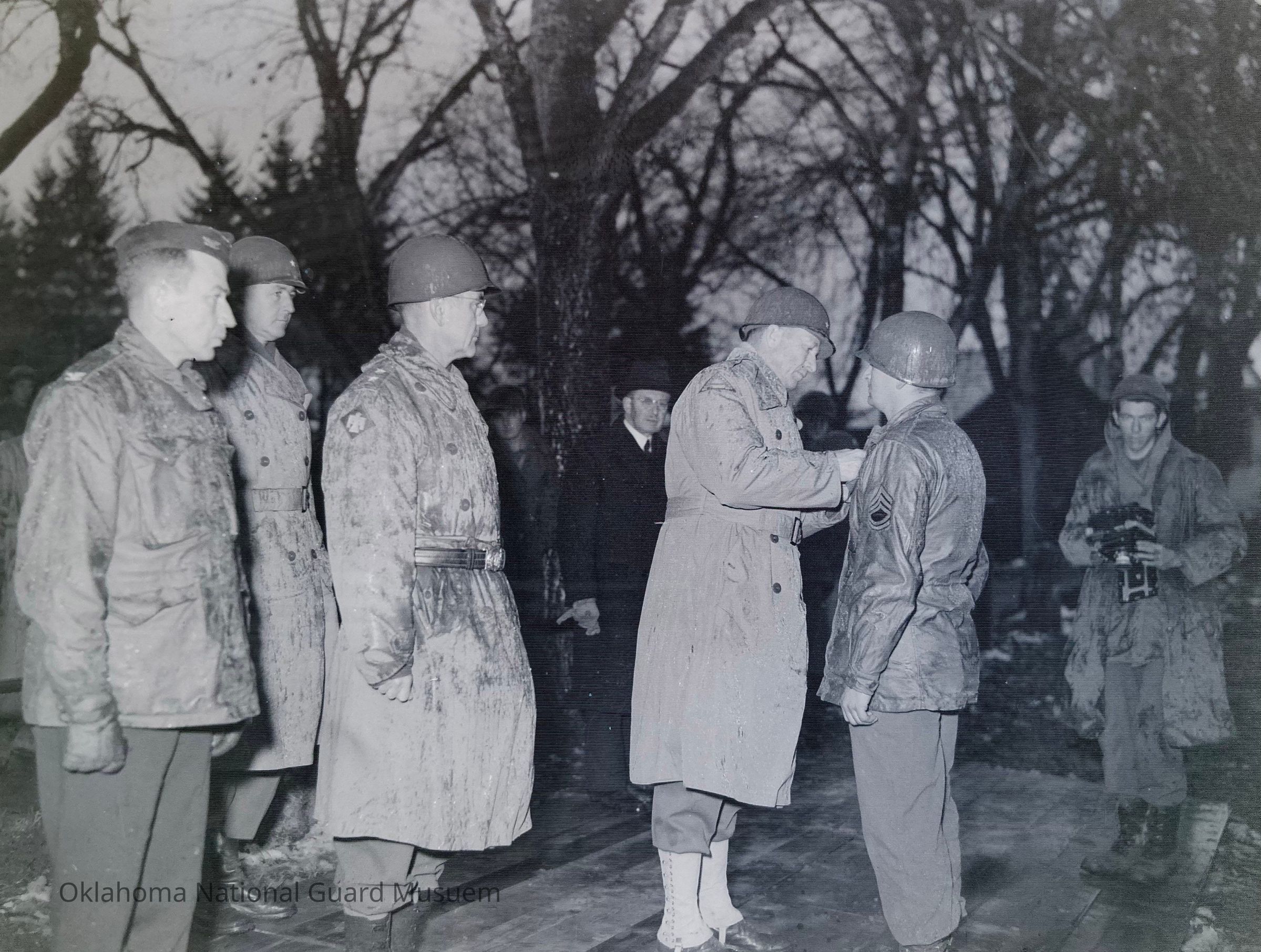 Negative of General Alexander Patch awarding decorations with General Eagles watching on