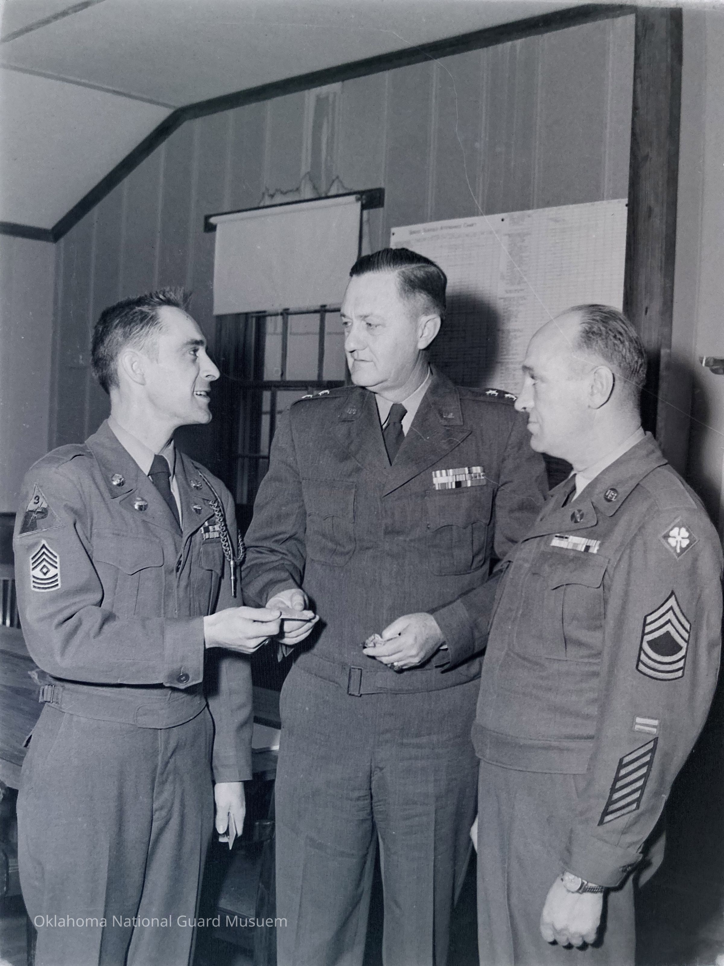 General James Styron and two soldiers conversing in an office