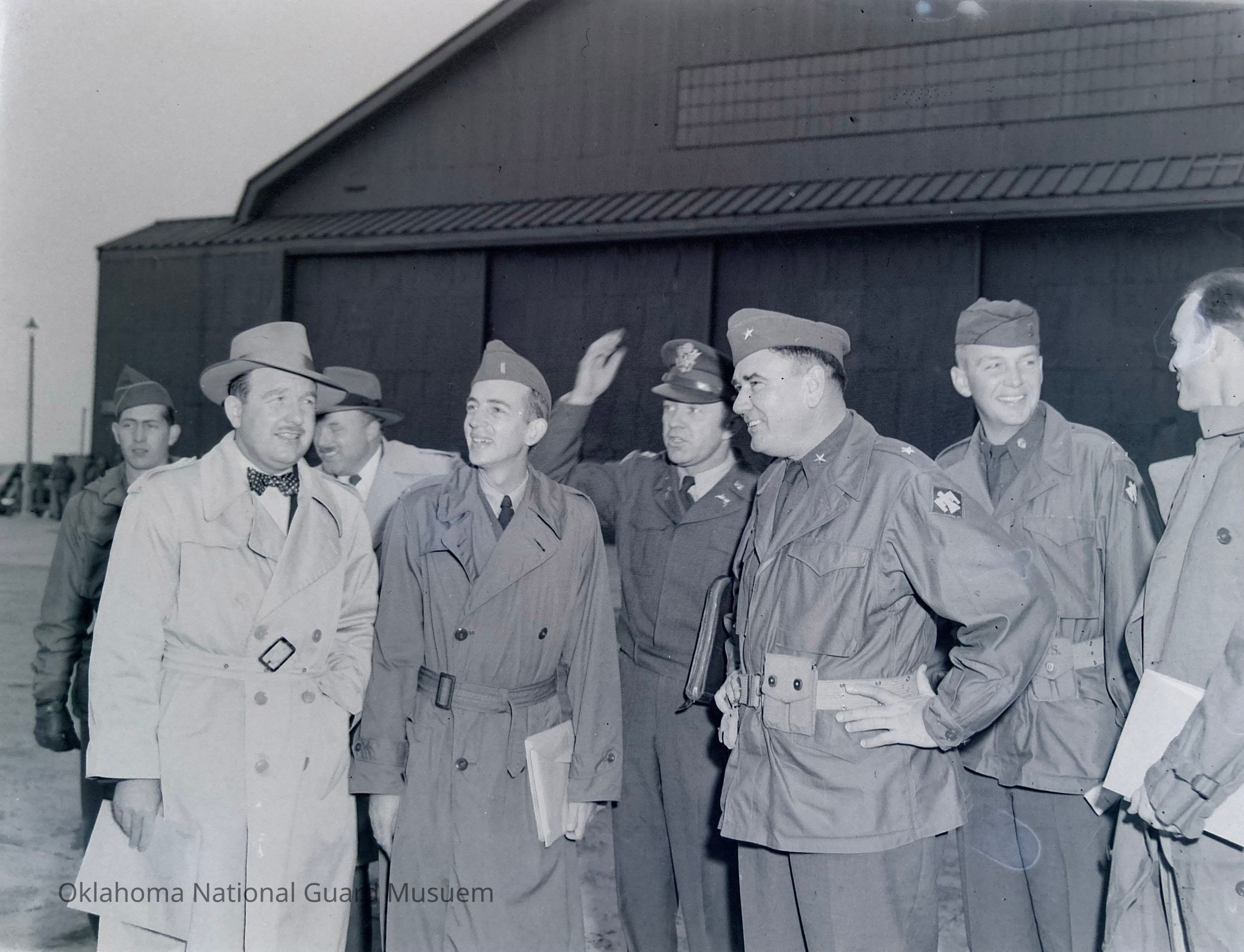 Negative of General Muldrow in front of an aircraft hangar with a civilian and several officers on Hokkaido, Japan