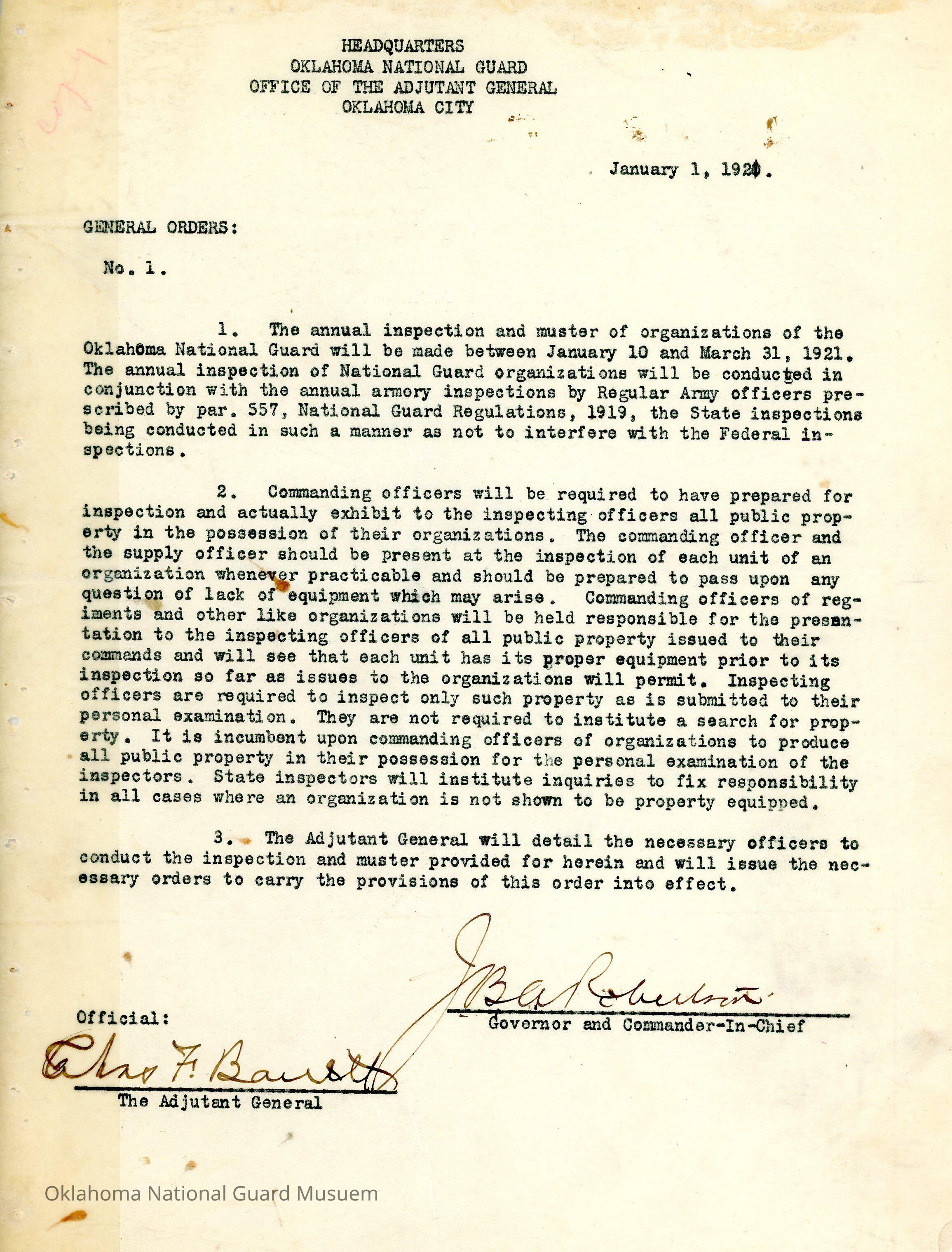 General Order #1 from Headquarters Adjutant General's Office in Oklahoma City. The order details the annual inspection and muster of organizations of the Oklahoma National Guard. The inspection will coincide with the annual armory inspections by Regular Army officers.Date(s) of Creation