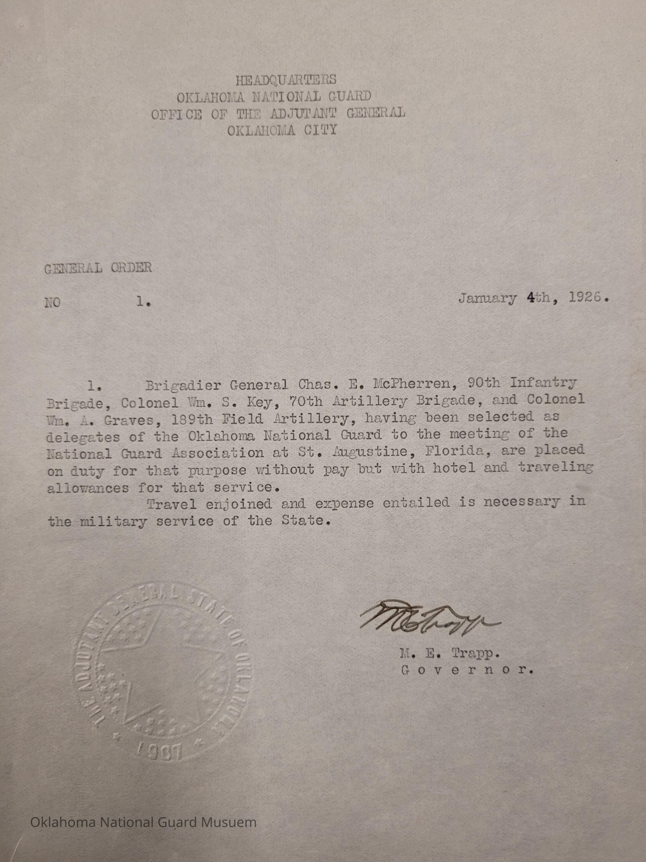 Adjutant General, Oklahoma City, Martin E. Trapp, Charles E. McPherren, 90th Infantry Brigade, William S. Key, 70th Artillery Brigade, William A. Graves, 189th Field Artillery, National Guard Association, St. Augustine, Florida