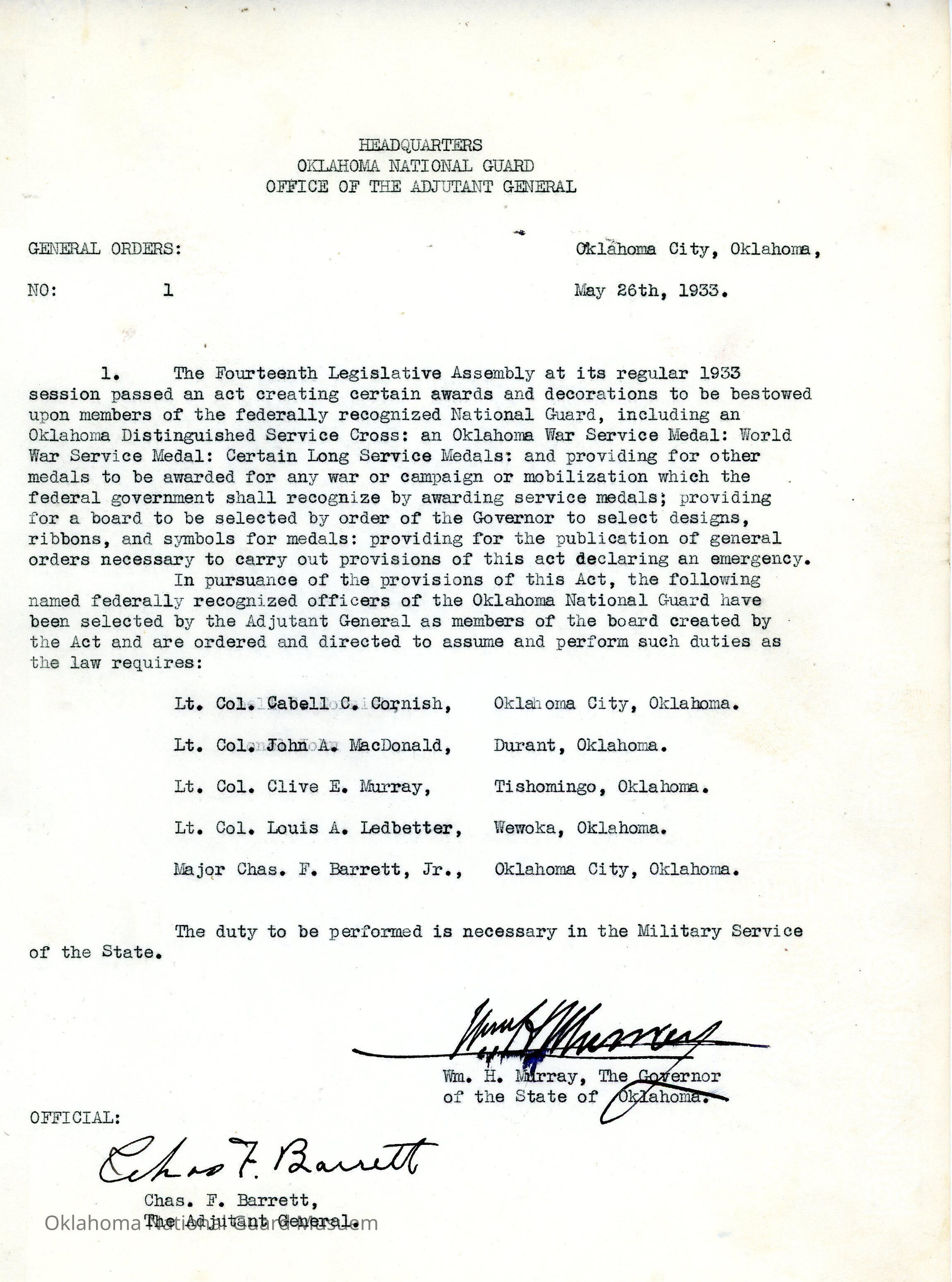 General Order #1 from Headquarters Adjutant General's Office in Oklahoma City. The order details the men of the Oklahoma National Guard who are to serve on the board to detail the specifics of the Oklahoma Distinguished Service Cross, Oklahoma War Service Medal, World War Service Medal, and Long Service MedalsDate(s) of Creation