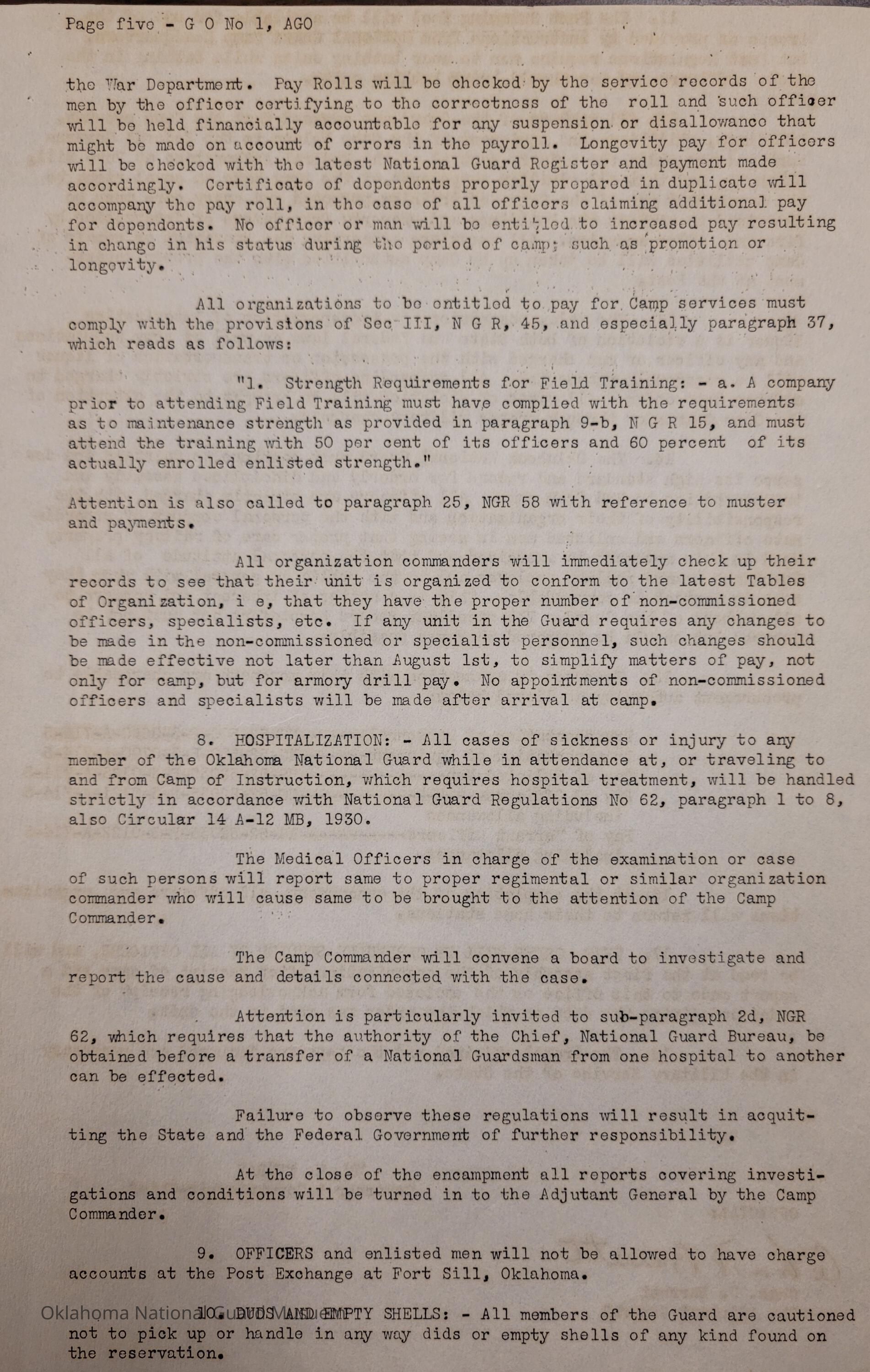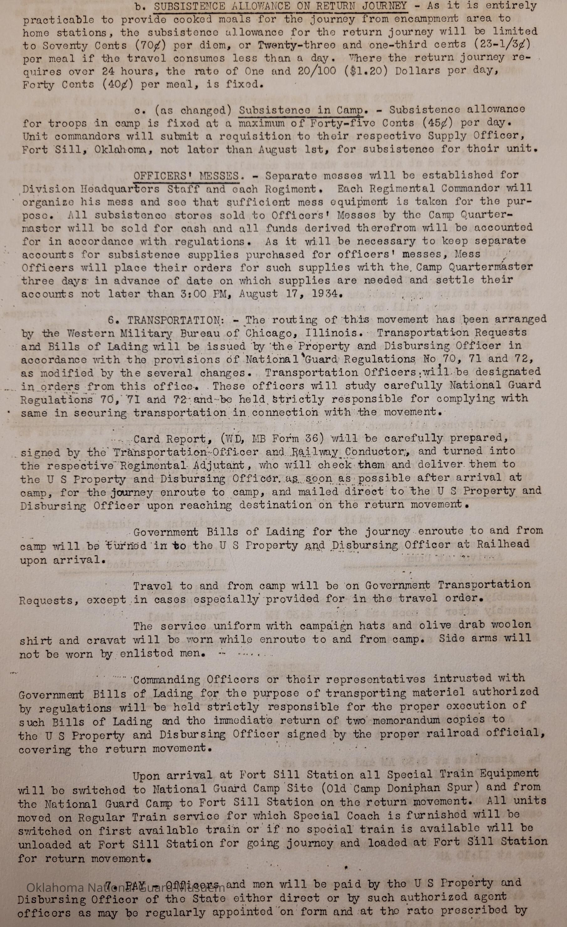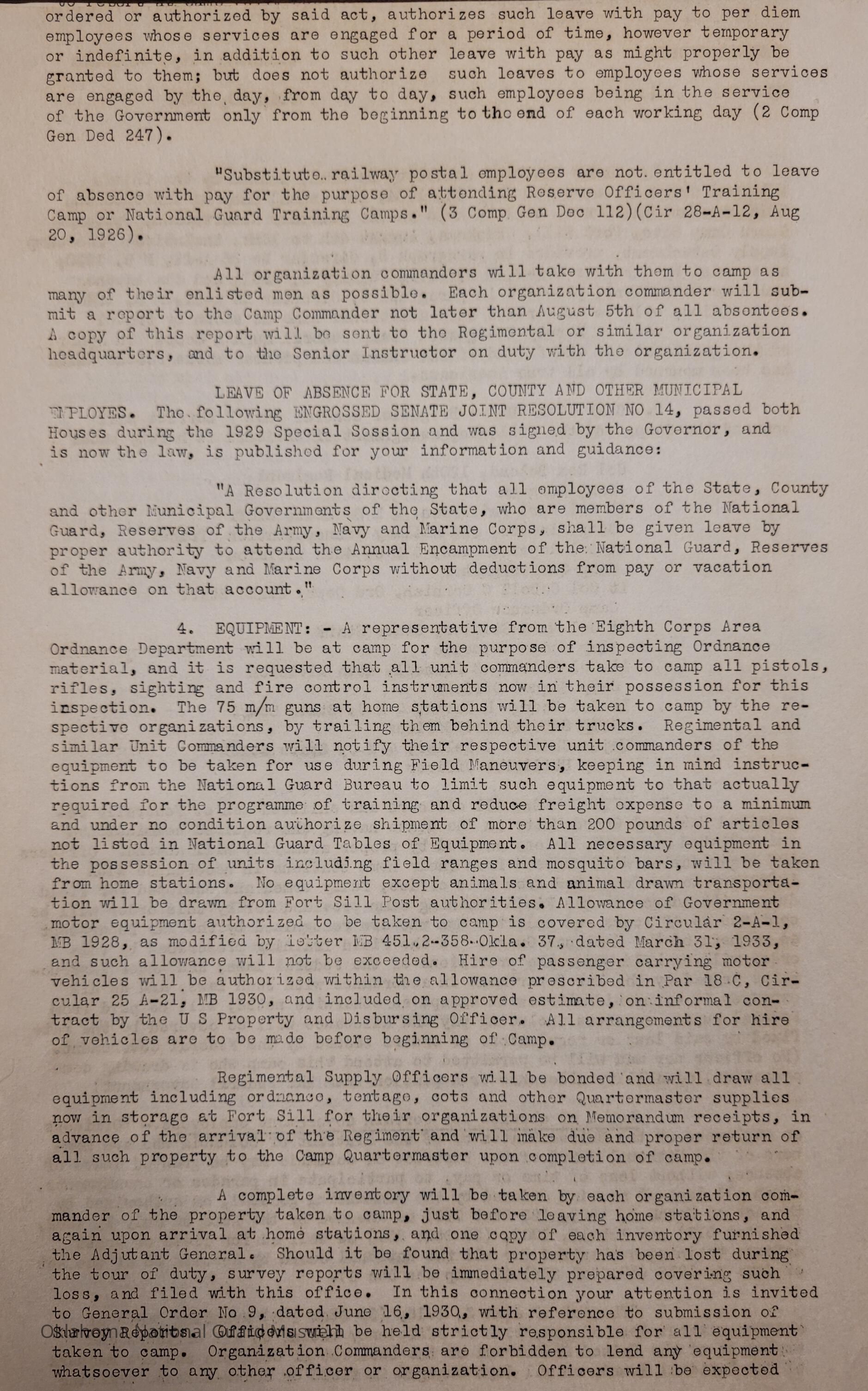 General Order #1 from Headquarters Adjutant General's Office in Oklahoma City. The order details the equipment, attendance, transportation, and pay for the Annual Camp of Instruction at Camp General Hugh L ScottDate(s) of Creation