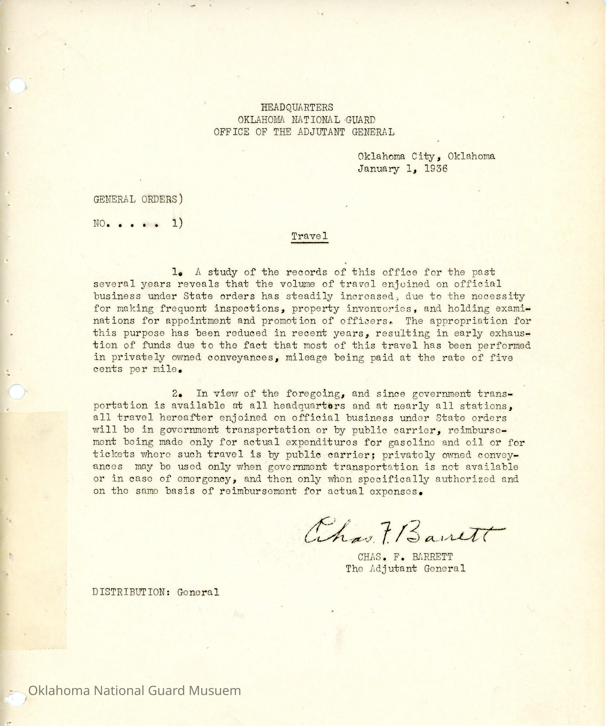 General Order #1 from Headquarters Adjutant General's Office in Oklahoma City. The order instructs the Oklahoma National Guard that all official business travel must be done in a government vehicle to save money and to stop using private vehicles for official travelDate(s) of Creation