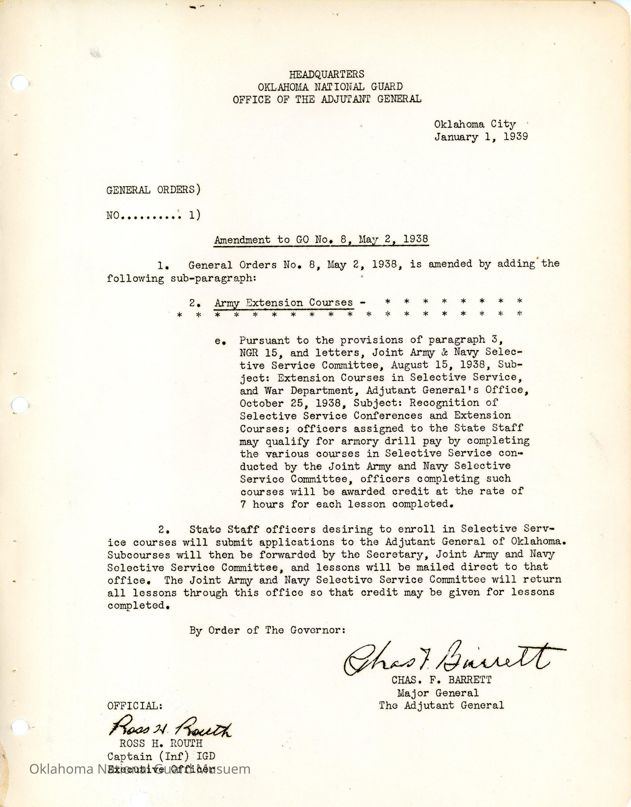 Adjutant General, Oklahoma City, Charles F. Barrett, Ross H. Routh, Amends, Amendment, Army Extension Courses, Selective Service Committee