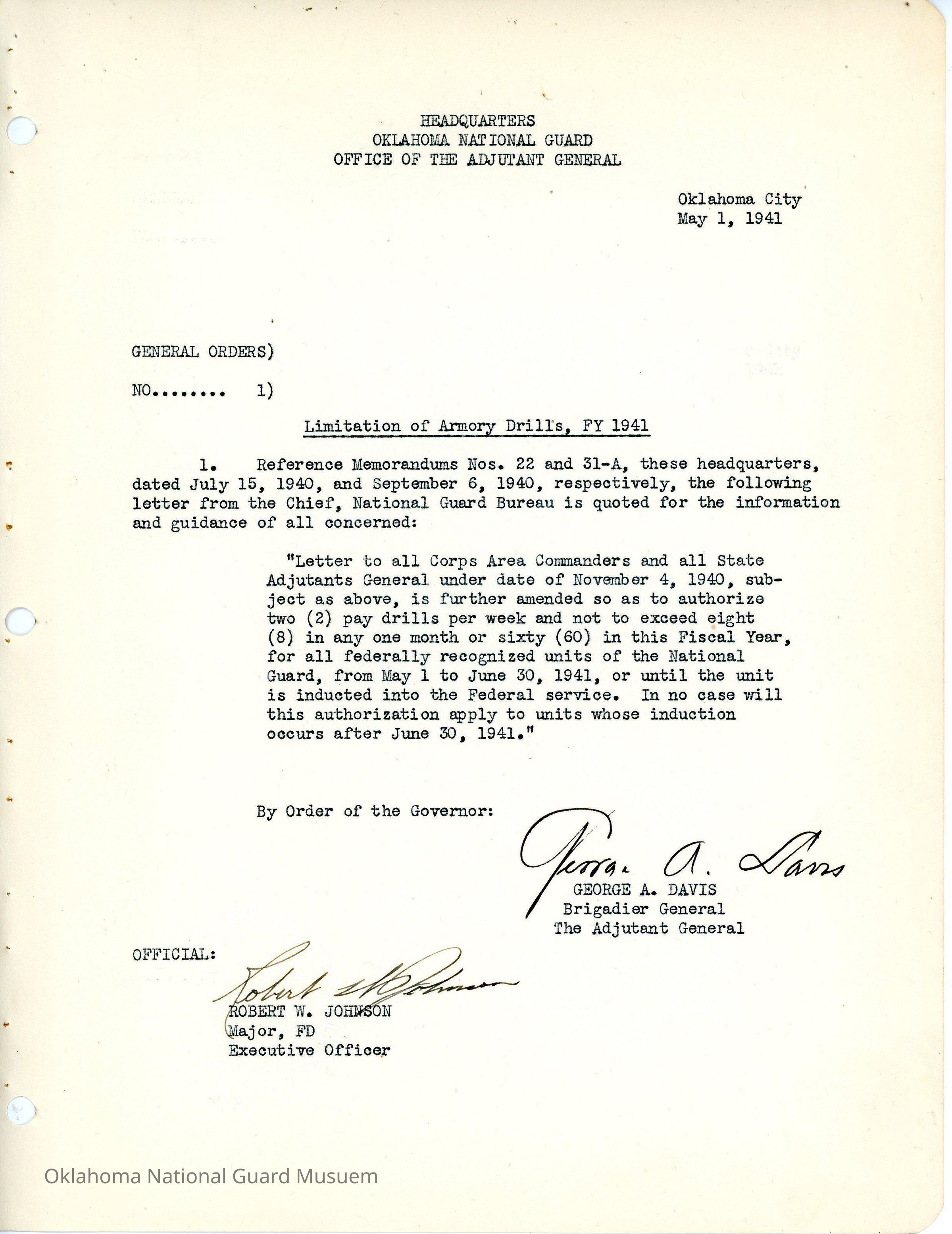 General Order #1 from Headquarters Adjutant General's Office in Oklahoma City. The order sets limits to the number of armory drills for 1941Date(s) of Creation