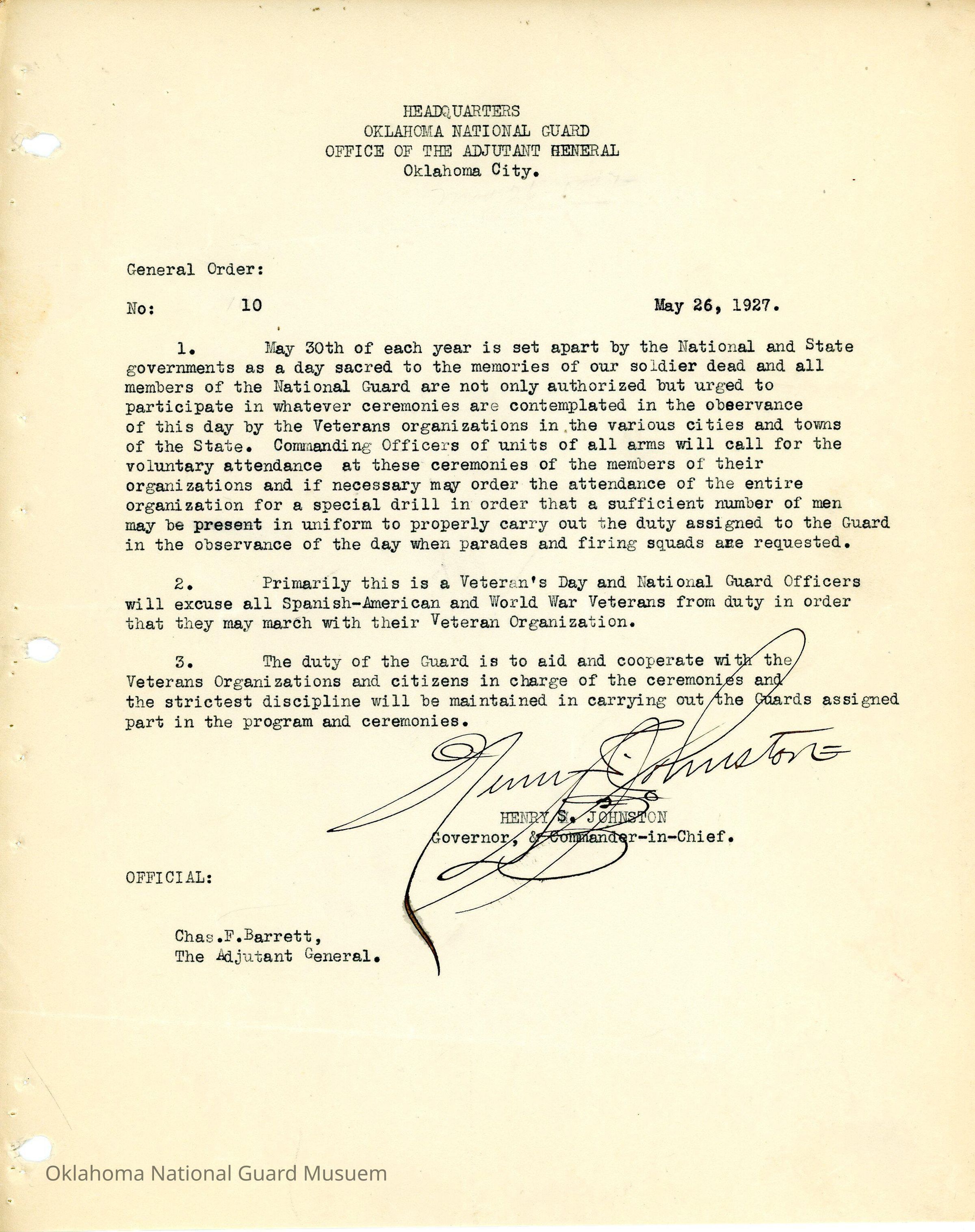 General Order #10 from Headquarters Adjutant General's Office in Oklahoma City. The order urges Oklahoma National Guard soldiers to participate in ceremonies for Memorial Day. Veterans of the Spanish-American War and World War One are excused from duty to march with their Veteran Organizations.Date(s) of Creation