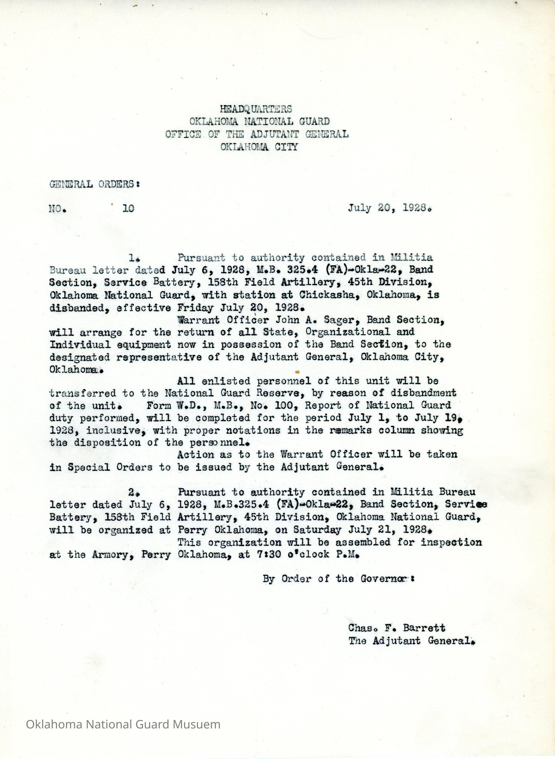 General Order #10 from Headquarters Adjutant General's Office in Oklahoma City. The order disbands Band Section 158th Field Artillery 45th Division stationed in Chickasha and re-organizes them in Perry.Date(s) of Creation
