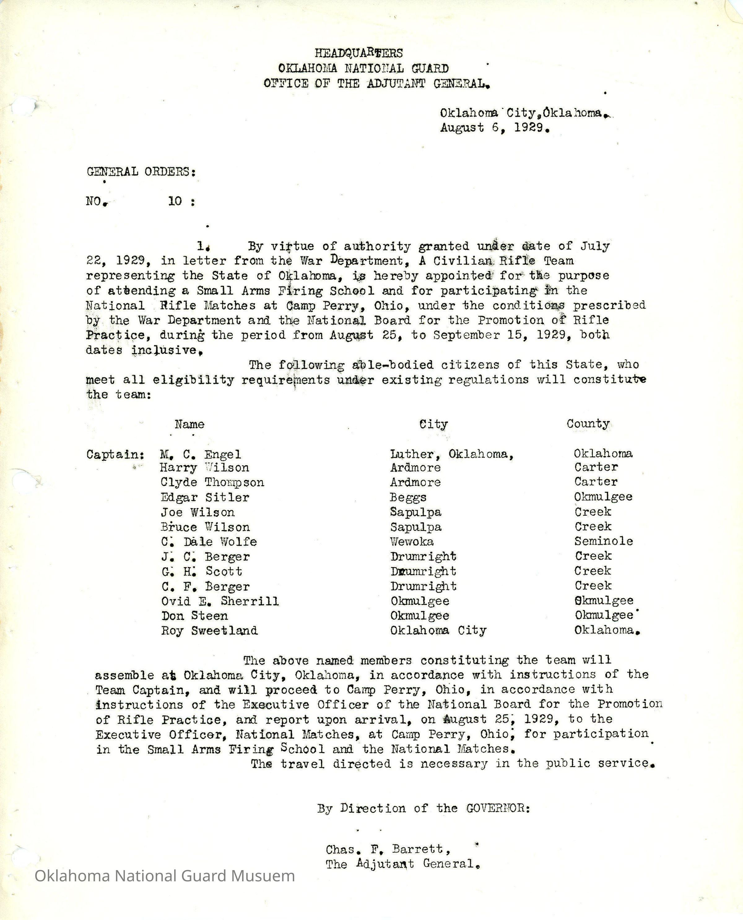 General Order #10 from Headquarters Adjutant General's Office in Oklahoma City. The order denotes the men who will serve on the Civilian Rifle Team and represent Oklahoma at the National Rifle Matches in Camp Perry, OhioDate(s) of Creation