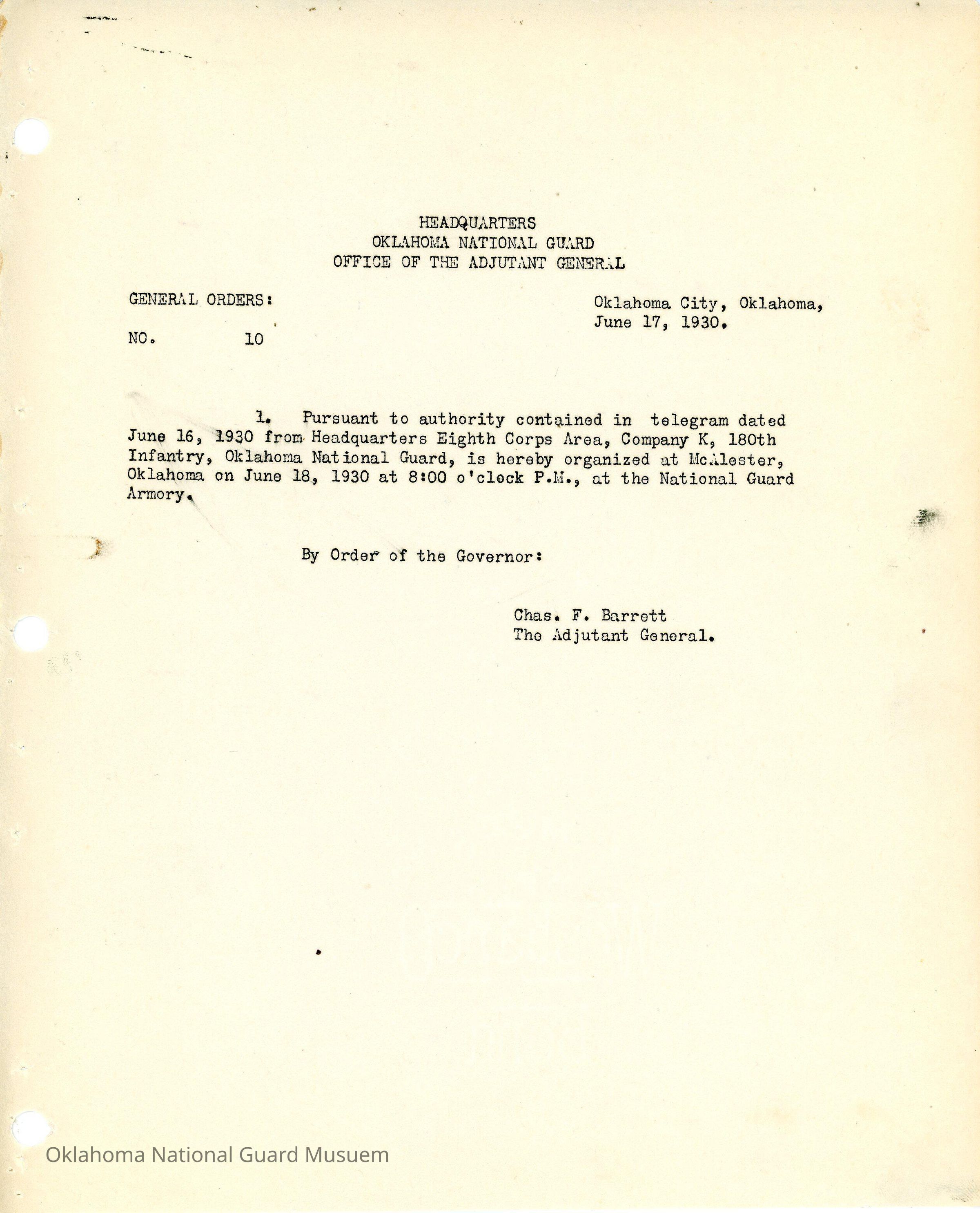 General Order #10 from Headquarters Adjutant General's Office in Oklahoma City. The order organizes Company K 180th Infantry sat McAlesterDate(s) of Creation