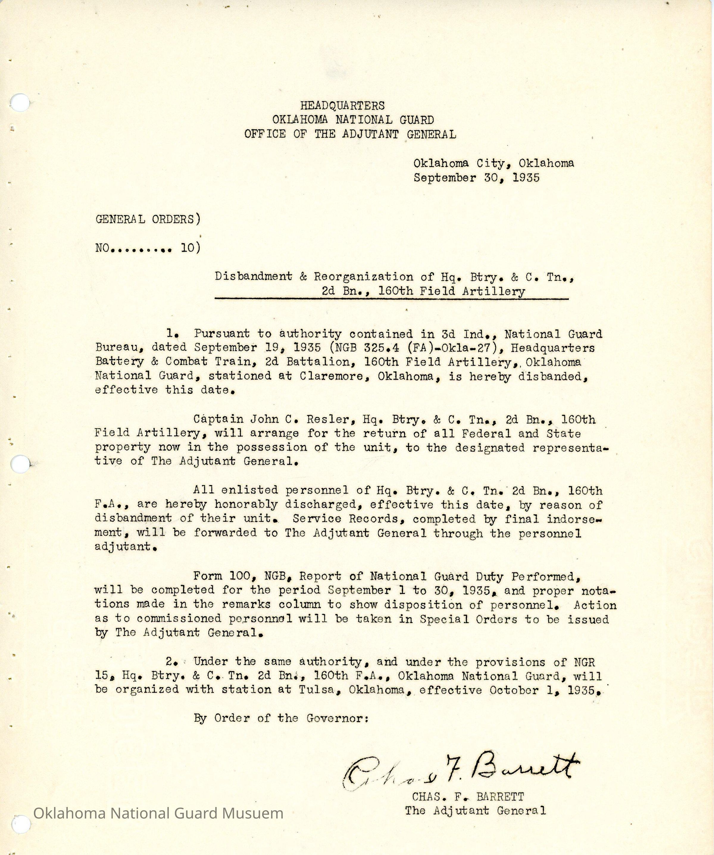 General Order #10 from Headquarters Adjutant General's Office in Oklahoma City. The order disbands Headquarters Battery and Combat Train 160th Field Artillery stationed in Claremore and reorganizes them in TulsaDate(s) of Creation