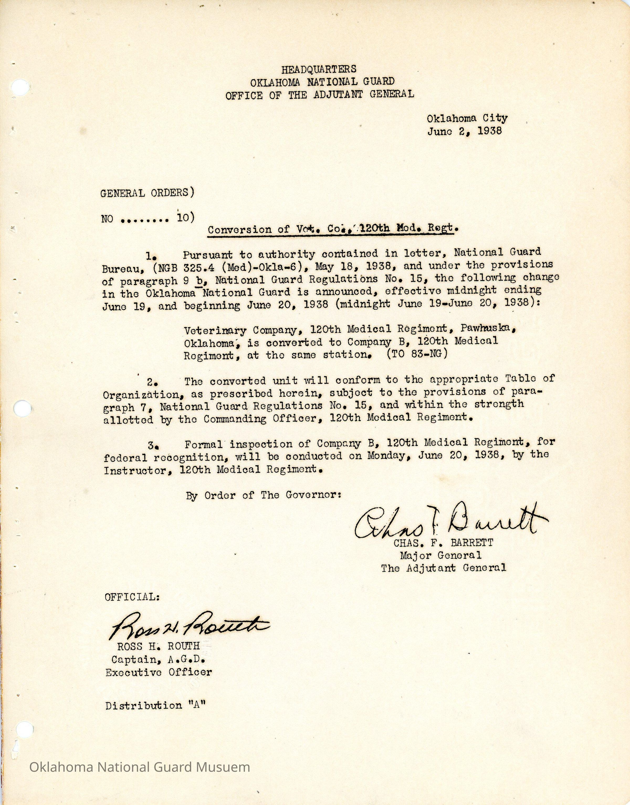 General Order #10 from Headquarters Adjutant General's Office in Oklahoma City. The order converts the Veterinary Company 120th Medical Regiment to Company B 120th Medical Regiment located in PawhuskaDate(s) of Creation