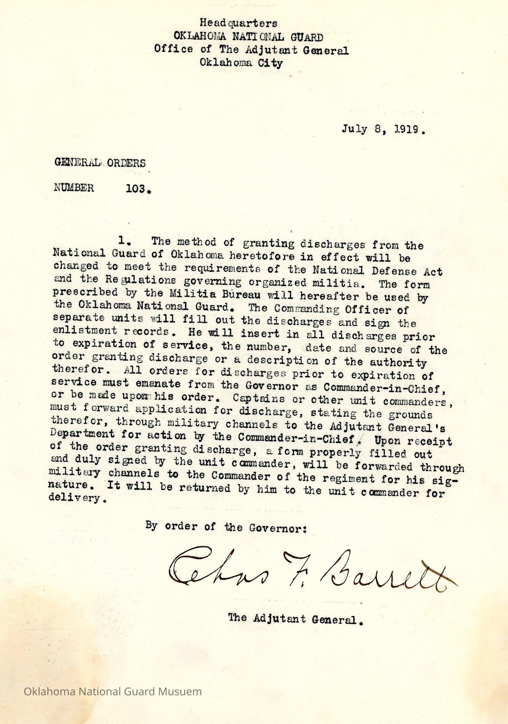 General Order #103 from Headquarters Adjutant General's Office in Oklahoma City. The order changes the method of discharge from the Oklahoma National Guard to comply with the National Defense ActDate(s) of Creation