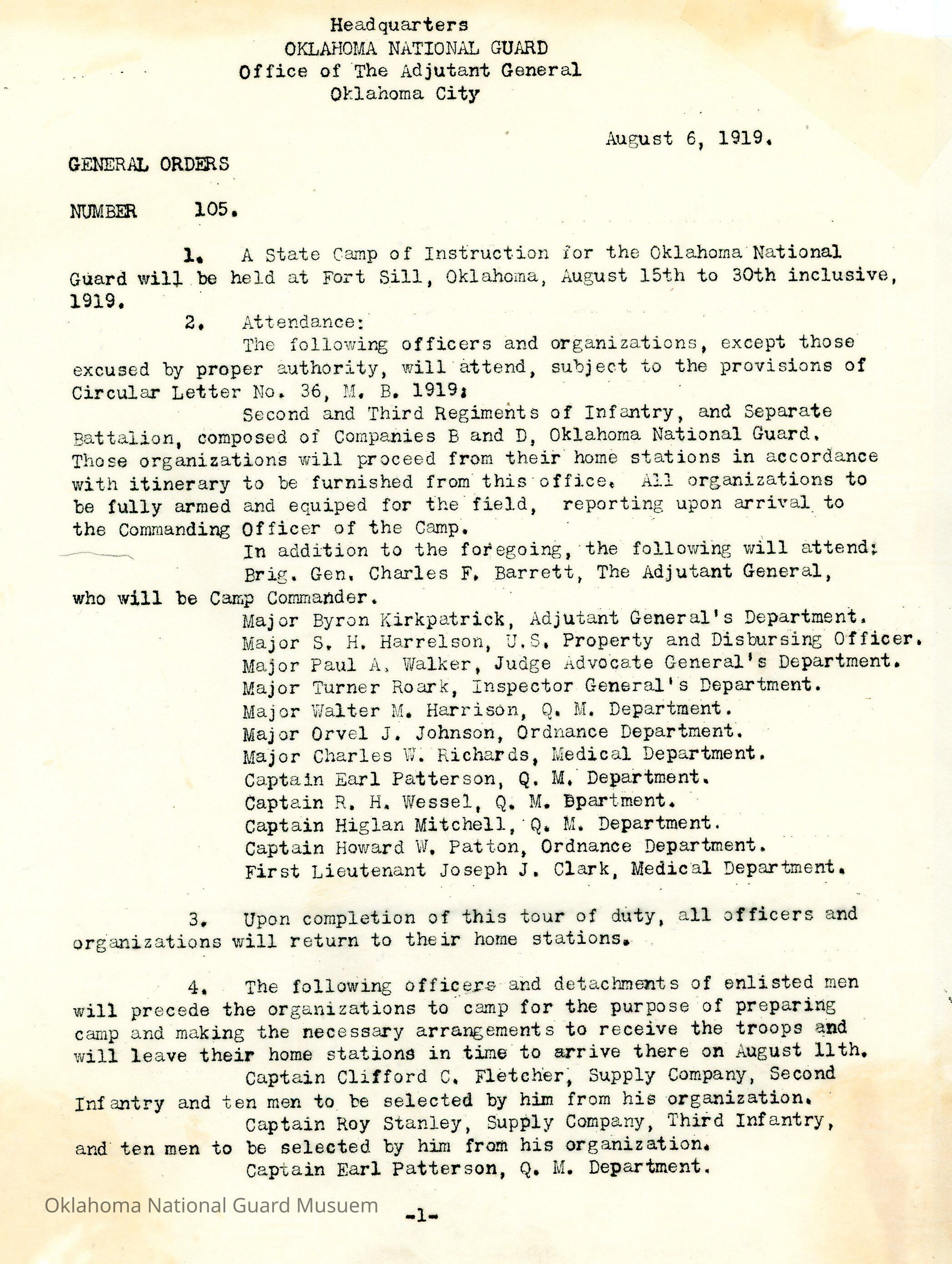 General Order #105 from Headquarters Adjutant General's Office in Oklahoma City. The order details a State Camp Inspection at Fort Sill, who is required to attend, and the procedure to be followed.Date(s) of Creation