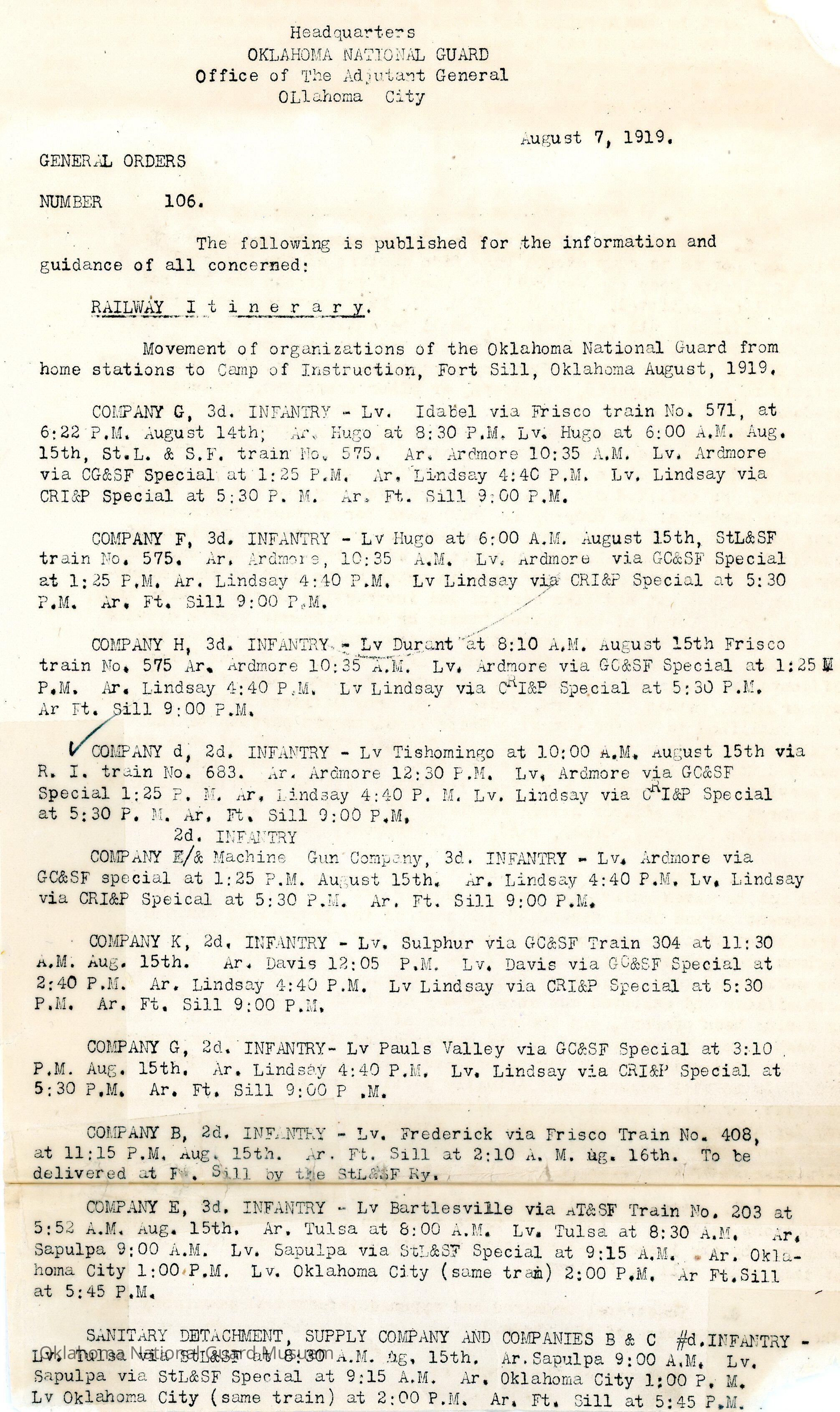 General Order #106 from Headquarters Adjutant General's Office in Oklahoma City. The order details the travel itinerary for the Oklahoma National Guard units to Fort Sill.Date(s) of Creation