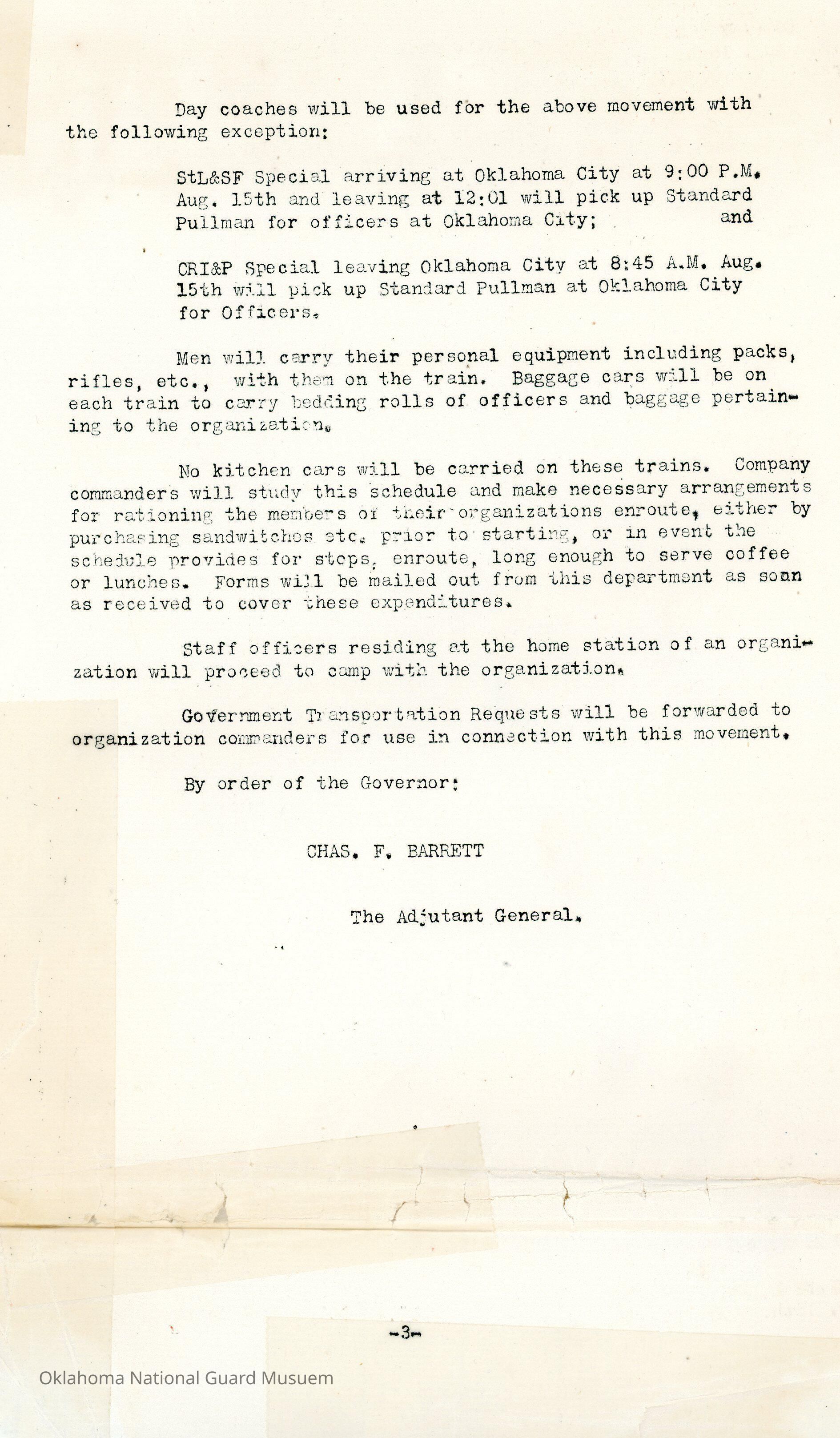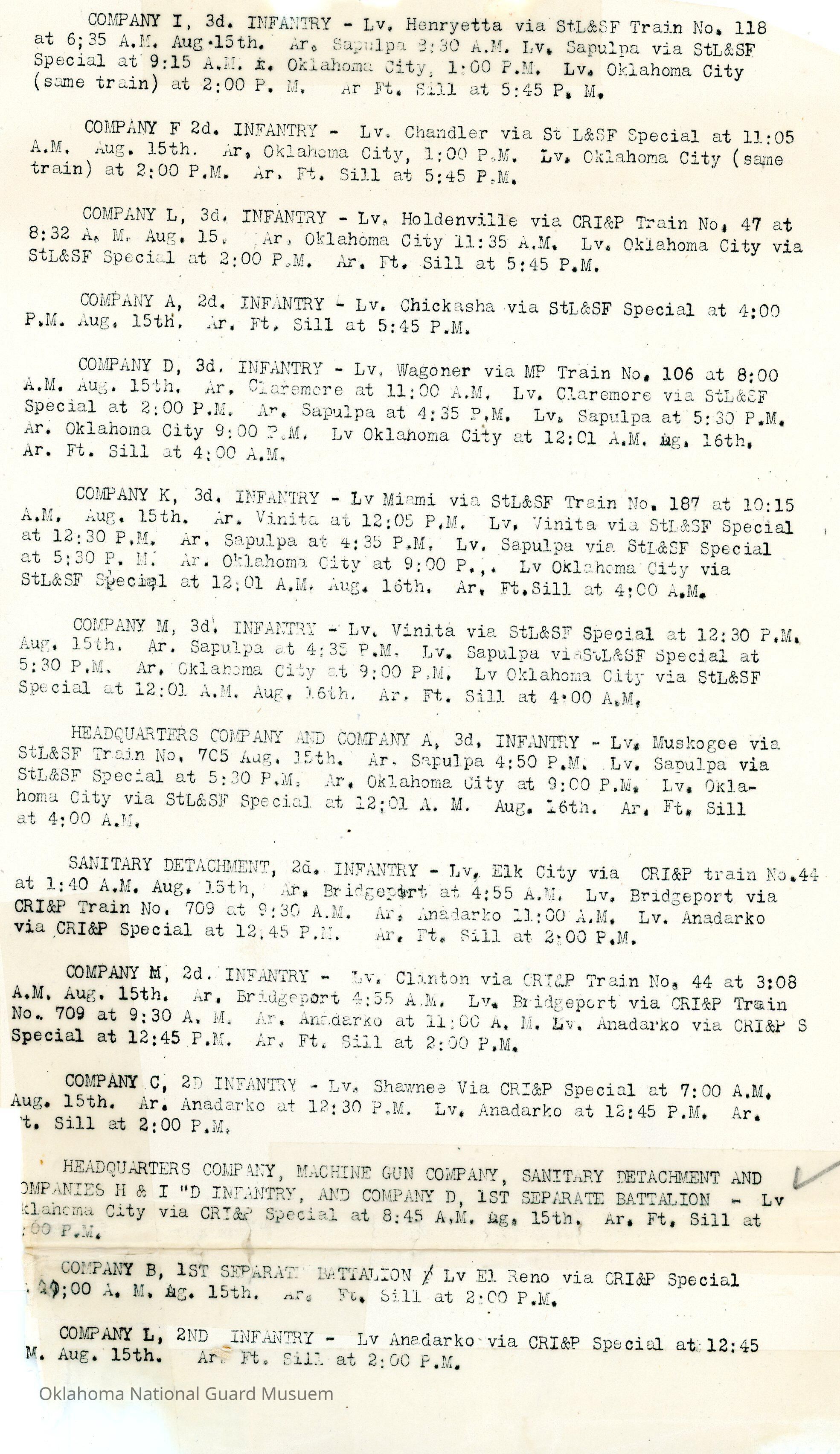 Adjutant General, Oklahoma City, Charles F. Barrett, Fort Sill, Train, Railroad, Transportation, Third Infantry, Idabel, Frisco, Hugo, Ardmore, Lindsay, Durant, Second Infantry, Tishomingo, Machine Gun Company, Sulphur, Davis, Pauls Valley, Frederick, Bartlesville, Tulsa, Sapulpa, Sanitary Detachment, Henryetta, Chandler, Holdenville, Chickasha, Wagoner, Claremore, Miami, Vinita, Muskogee, Elk City, Bridgeport, Anadarko, Clinton, Shawnee, First Separate Battalion, El Reno