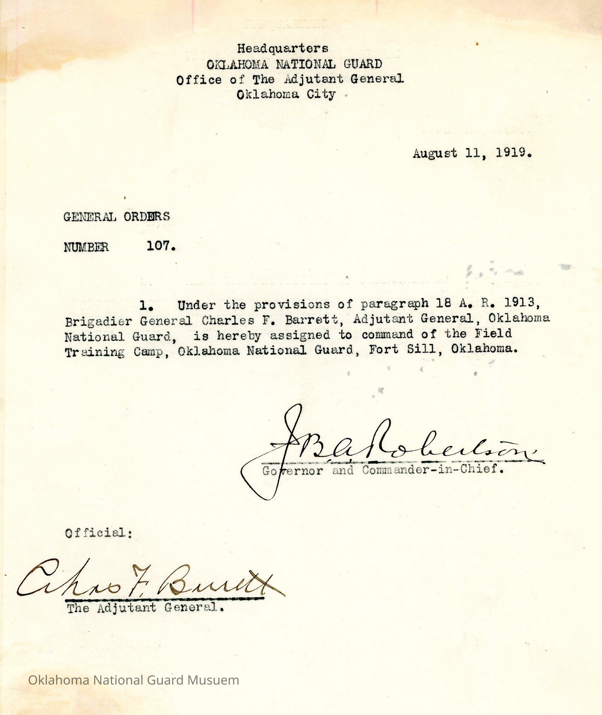 General Order #107 from Headquarters Adjutant General's Office in Oklahoma City. The order instructs Charles F. Barrett to command the Field Training Camp at Fort SillDate(s) of Creation