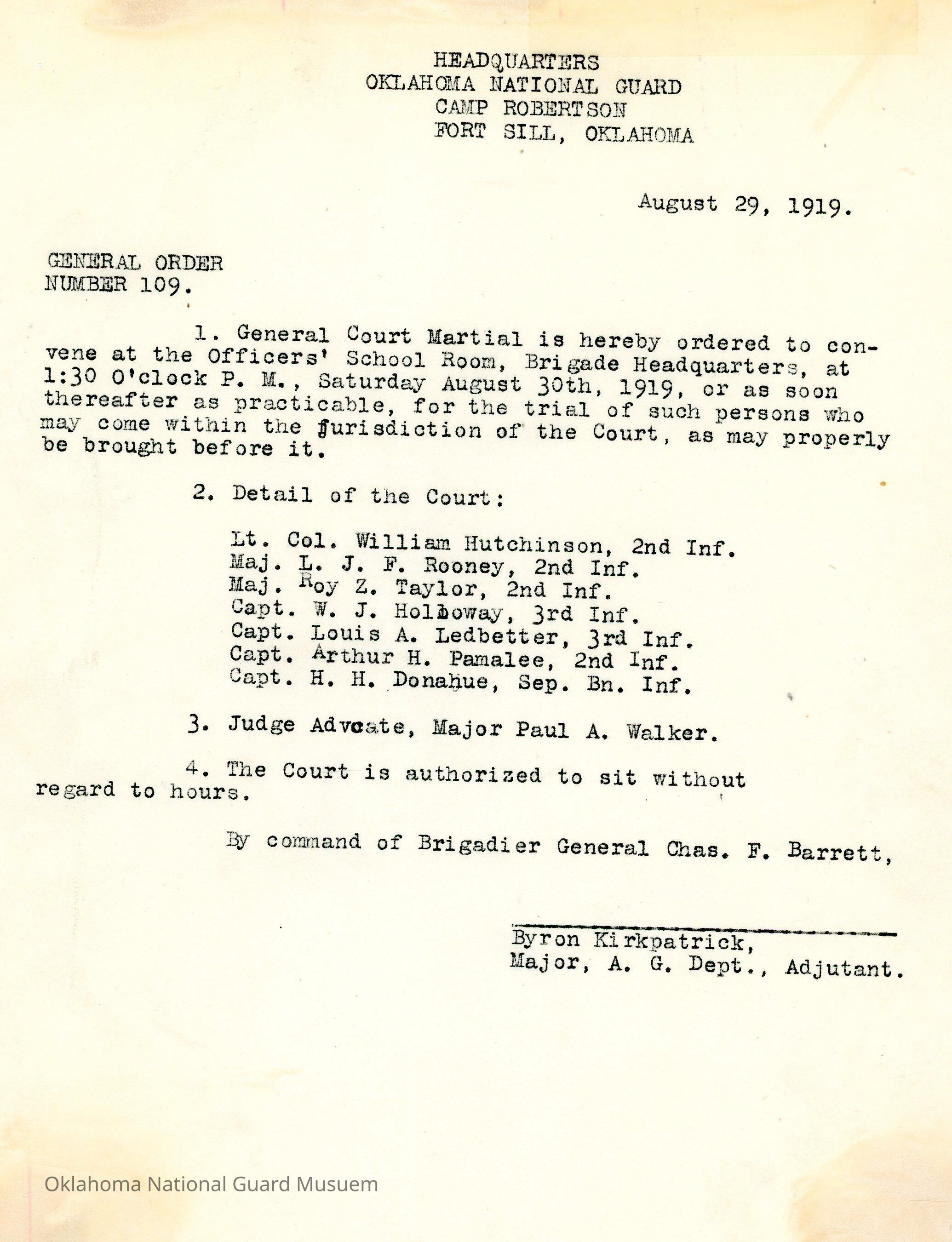 Adjutant General, Fort Sill, Charles F. Barrett, Court Martial, William Hutchinson, L.J.F. Rooney, Roy Z. Taylor, W.J. Holloway, Louis A. Ledbetter, Arthur H. Pamalee, H.H. Donahue, Paul A. Walker, Byron Kirkpatrick, Second Infantry, Third Infantry