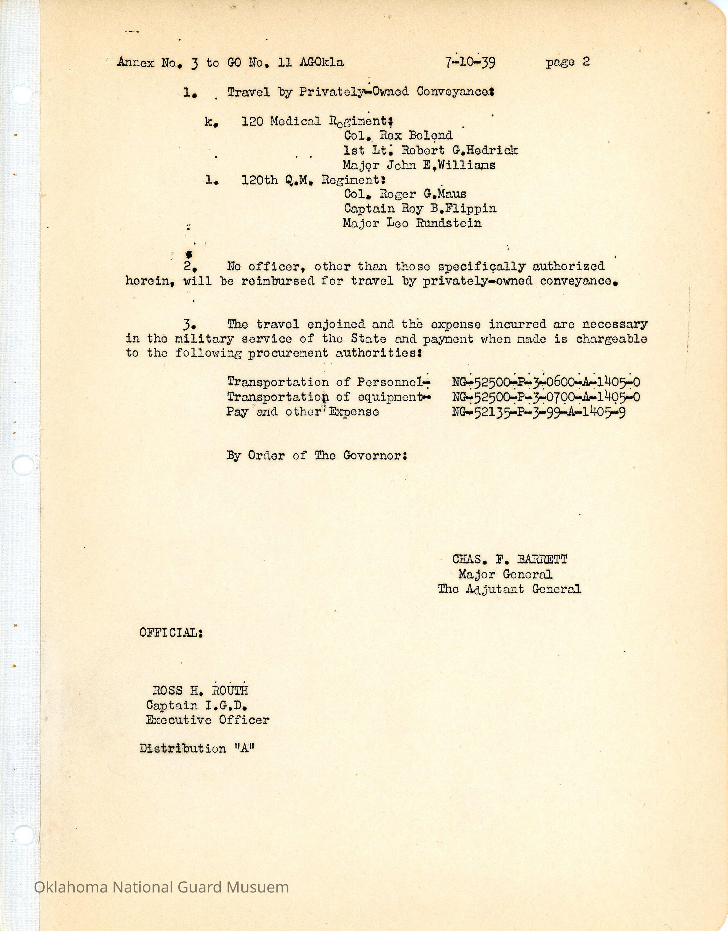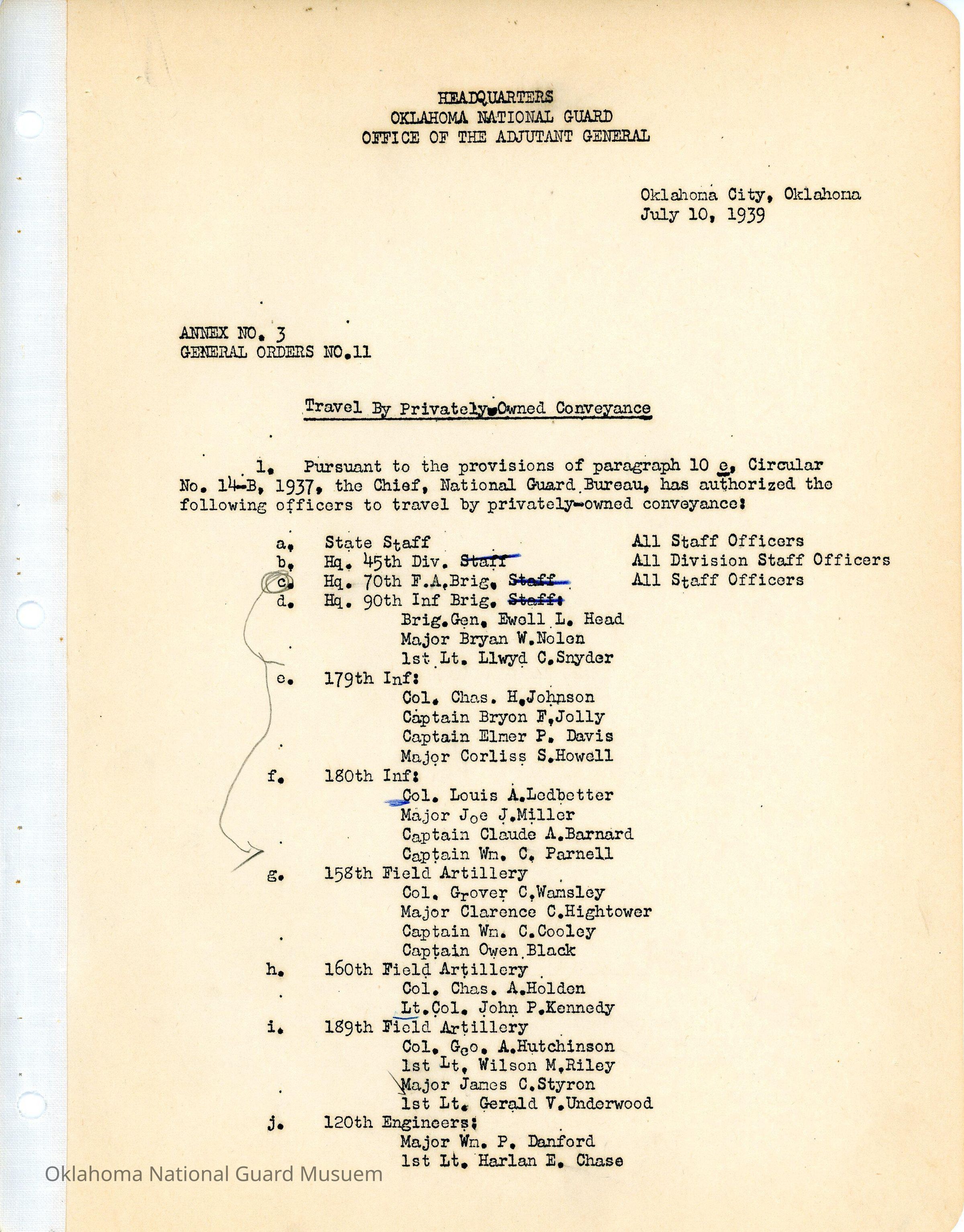 Adjutant General, Oklahoma City, Charles F. Barrett, Ross H. Routh, Private vehicles, Private conveyance, National Guard Bureau, 45th Division, 90th Infantry Brigade, Ewell L. Head, 179th Infantry, 180th Infantry, 70th Field Artillery Brigade, 158th Field Artillery, 160th Field Artillery, 189th Field Artillery, 120th Engineers, 120th Medical Regiment, 120th Quartermaster Regiment, Travel, Bryan W. Nolen, Llwyd C. Snyder, Charles H. Johnson, Bryon F. Jolly, Elmer P. Davis, Corliss S. Howell, Louis A. Ledbetter, Joe J. Miller, Claude A. Barnard, William C. Parnell, Grover C. Wamsley, Clarence C. Hightower, William C. Cooley, Owen Black, Charles A. Holen, John P. Kennedy, George A. Hutchinson, Wilson M. Riley, James C. Styron, Gerald V. Underwood, William P. Danford, Harlan E. Chase, Rex Bolend, Robert G. Hedrick, John E. Williams, Roger G. Maus, Roy B. Flippin, Leo Rundstein