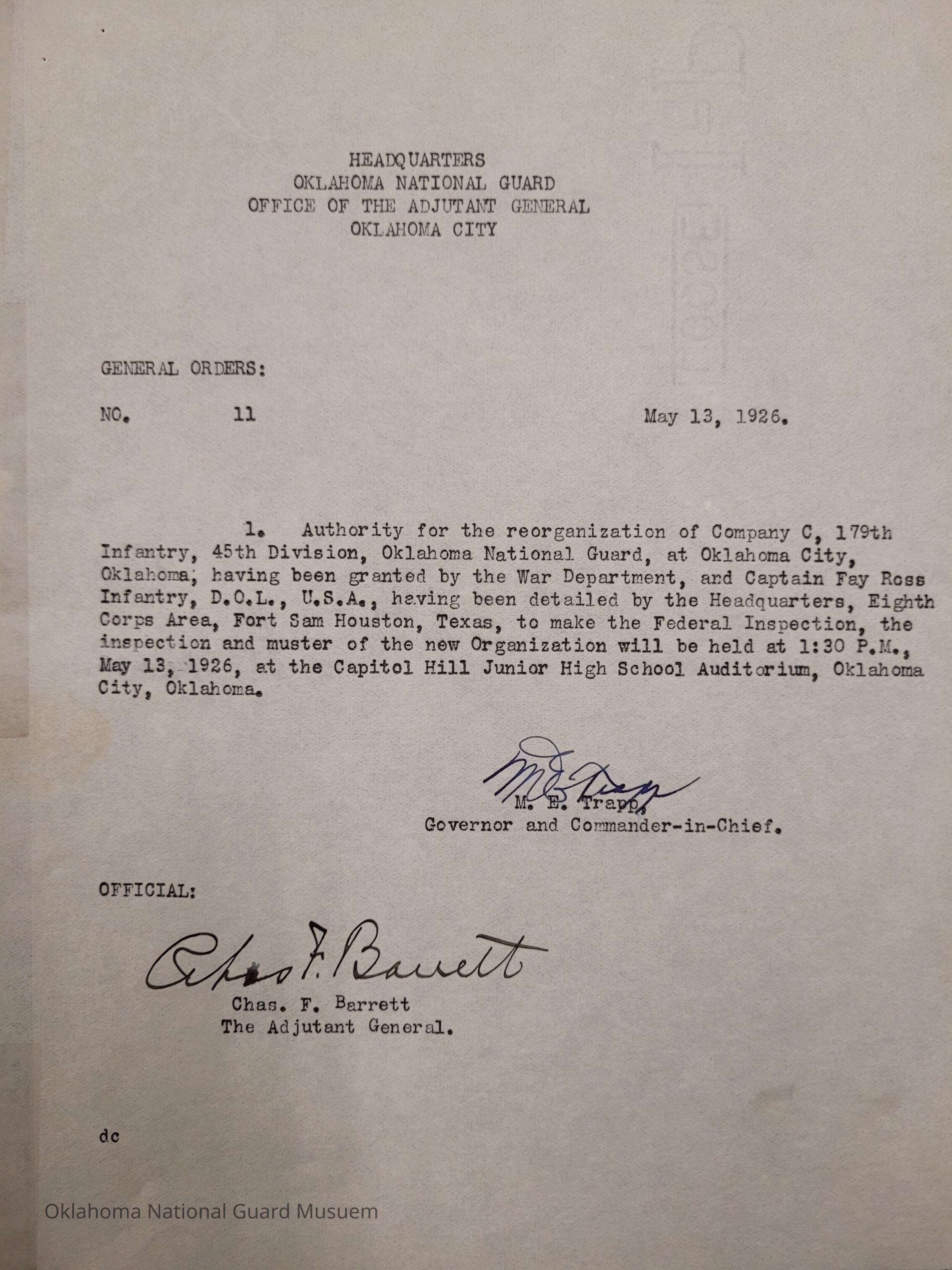 General Order #11 from Headquarters Adjutant General's Office in Oklahoma City. The order details the inspection of Company C 179th Infantry 45th Division located in Oklahoma CityDate(s) of Creation