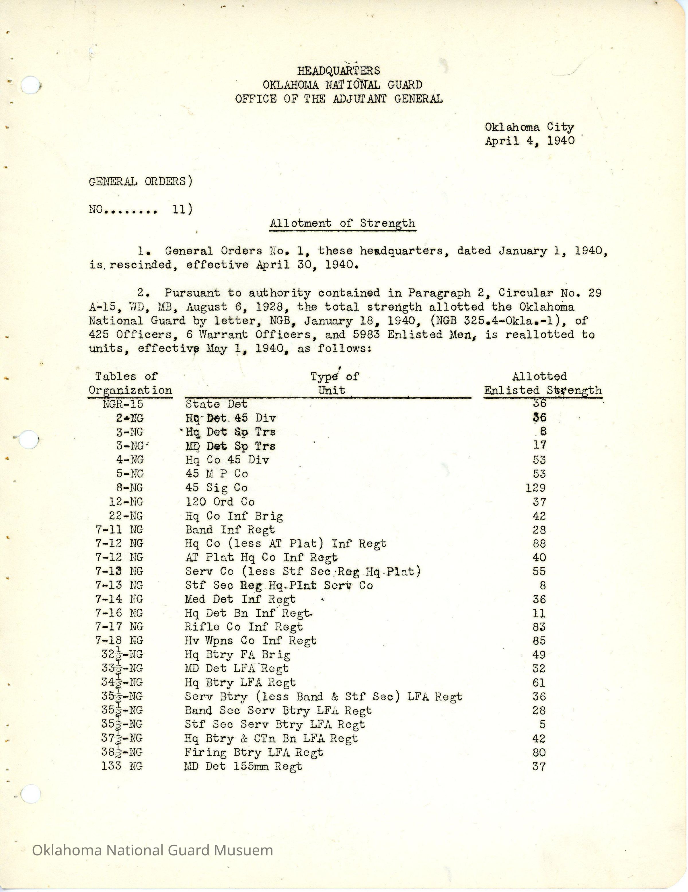 General Order #11 from Headquarters Adjutant General's Office in Oklahoma City. The order rescinds General Order #1 1940 and establishes new strength allotment numbers for the Oklahoma GuardDate(s) of Creation