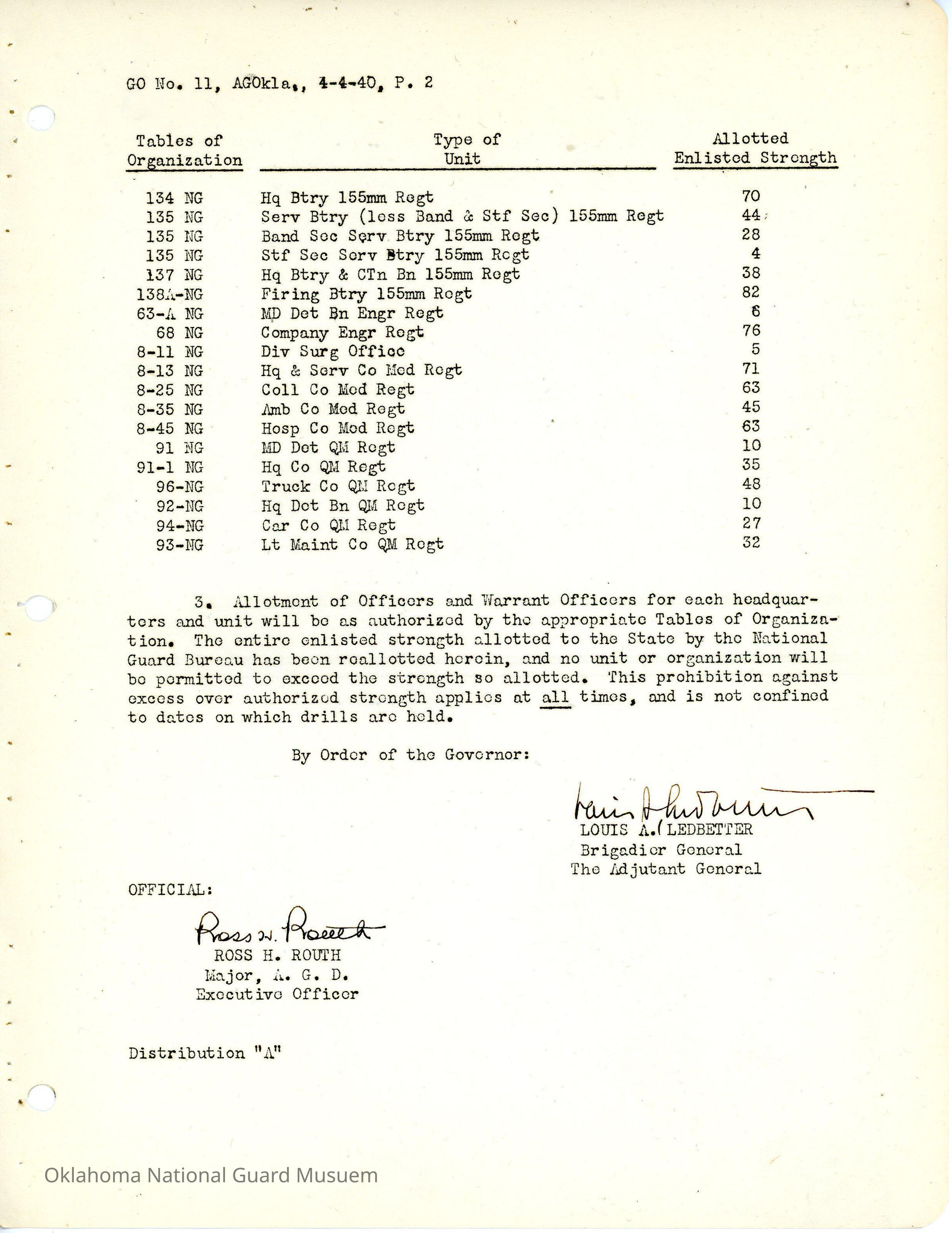 Adjutant General, Oklahoma City, Louis Ledbetter, Ross H. Routh, Rescinds, Allotment of Strength, 45th Division, 90th Infantry Brigade, 179th Infantry, 180th Infantry, 70th Field Artillery Brigade, 158th Field Artillery, 160th Field Artillery, 189th Field Artillery, 120th Engineers, 120th Medical Regiment, 120th Quartermaster Regiment