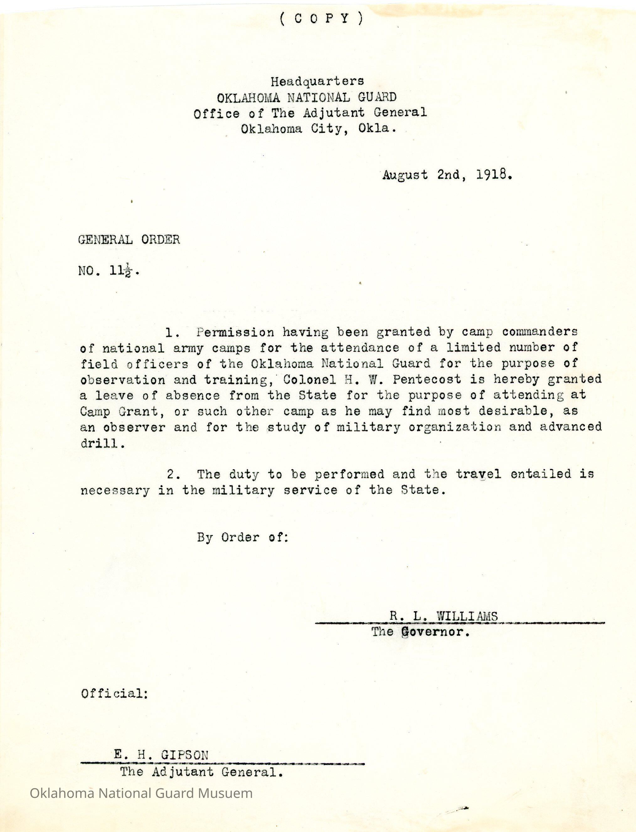 General Order #11.5 from Headquarters Adjutant General's Office in Oklahoma City. The order grants permission to Colonel H. W. Pentecost leave of absence to attend Camp Grant, or other camp, as an observer to study military organization and advanced drill.Date(s) of Creation