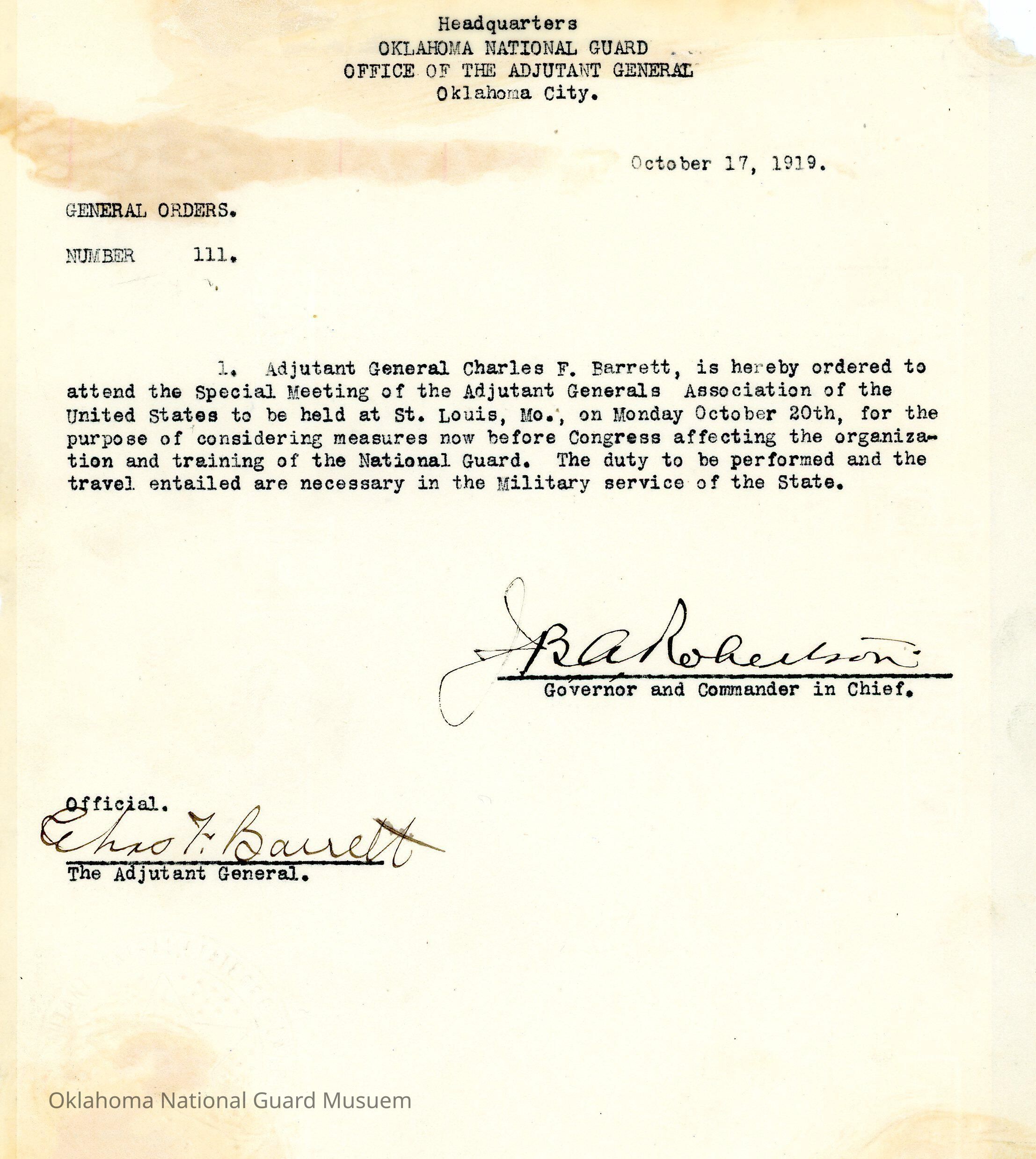 General Order #111 from Headquarters Adjutant General's Office in Oklahoma City. The order instructs Charles F. Barrett to attend the Special Meeting of the Adjutant Generals Association in St. Louis, Missouri.Date(s) of Creation