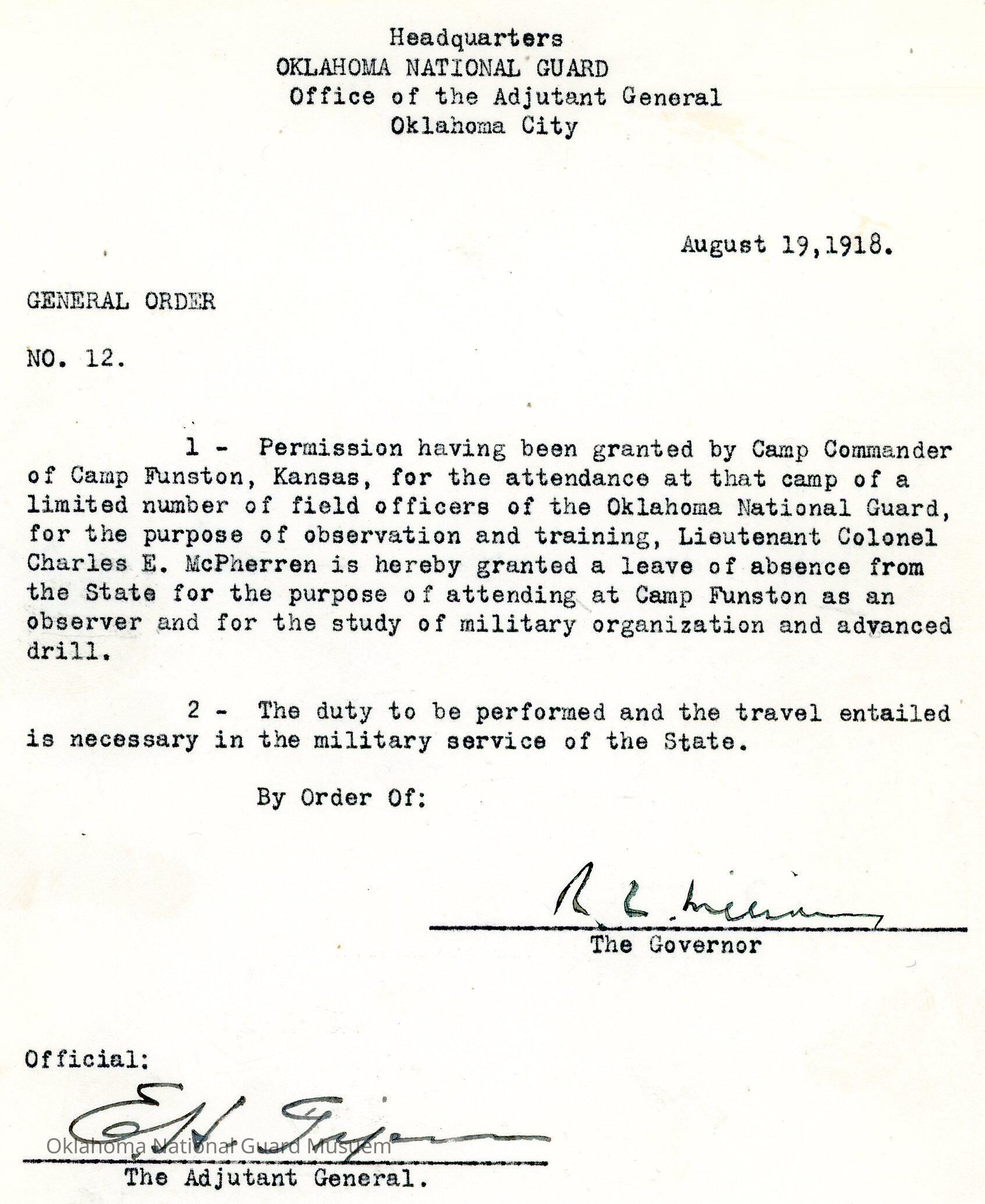 General Order #12 from Headquarters Adjutant General's Office in Oklahoma City. The order grants permission to Lieutenant Colonel Charles E. McPherren leave of absence to attend Camp Funston, Kansas as an observer to study military organization and advanced drill.Date(s) of Creation