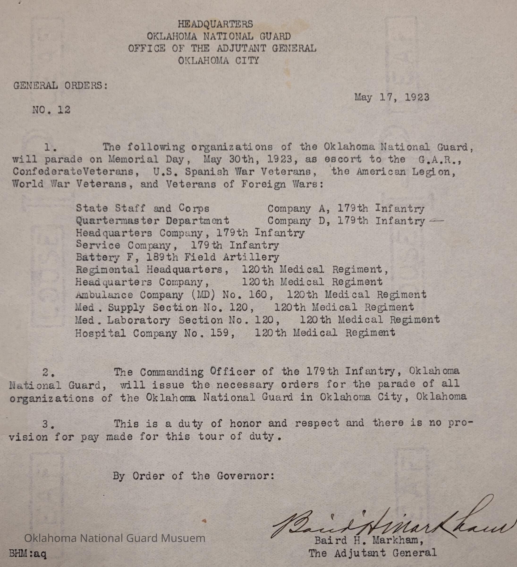 Adjutant General, Oklahoma City, Baird H. Markham, Veterans, Memorial Day, Parade, 179th Infantry, 120th Medical Regiment, 189th Field Artillery, Holiday