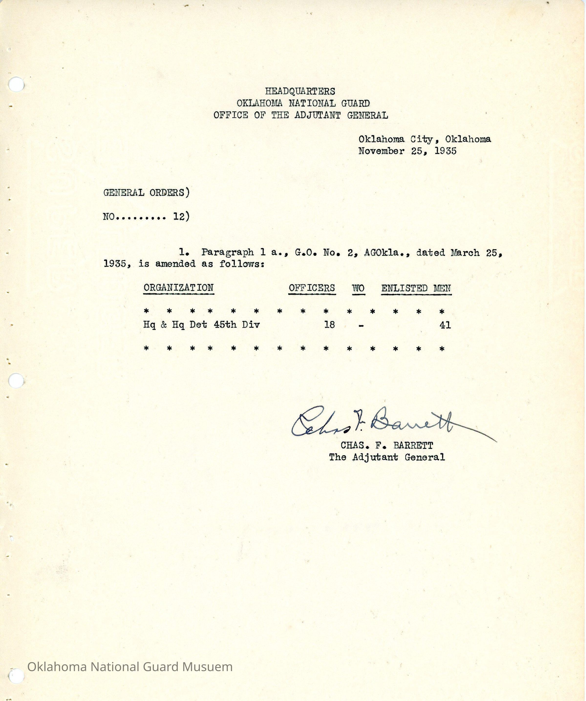 General Order #12 from Headquarters Adjutant General's Office in Oklahoma City. The order corrects General Order #2 1935 with the accurate strength information for 45th Division HeadquartersDate(s) of Creation
